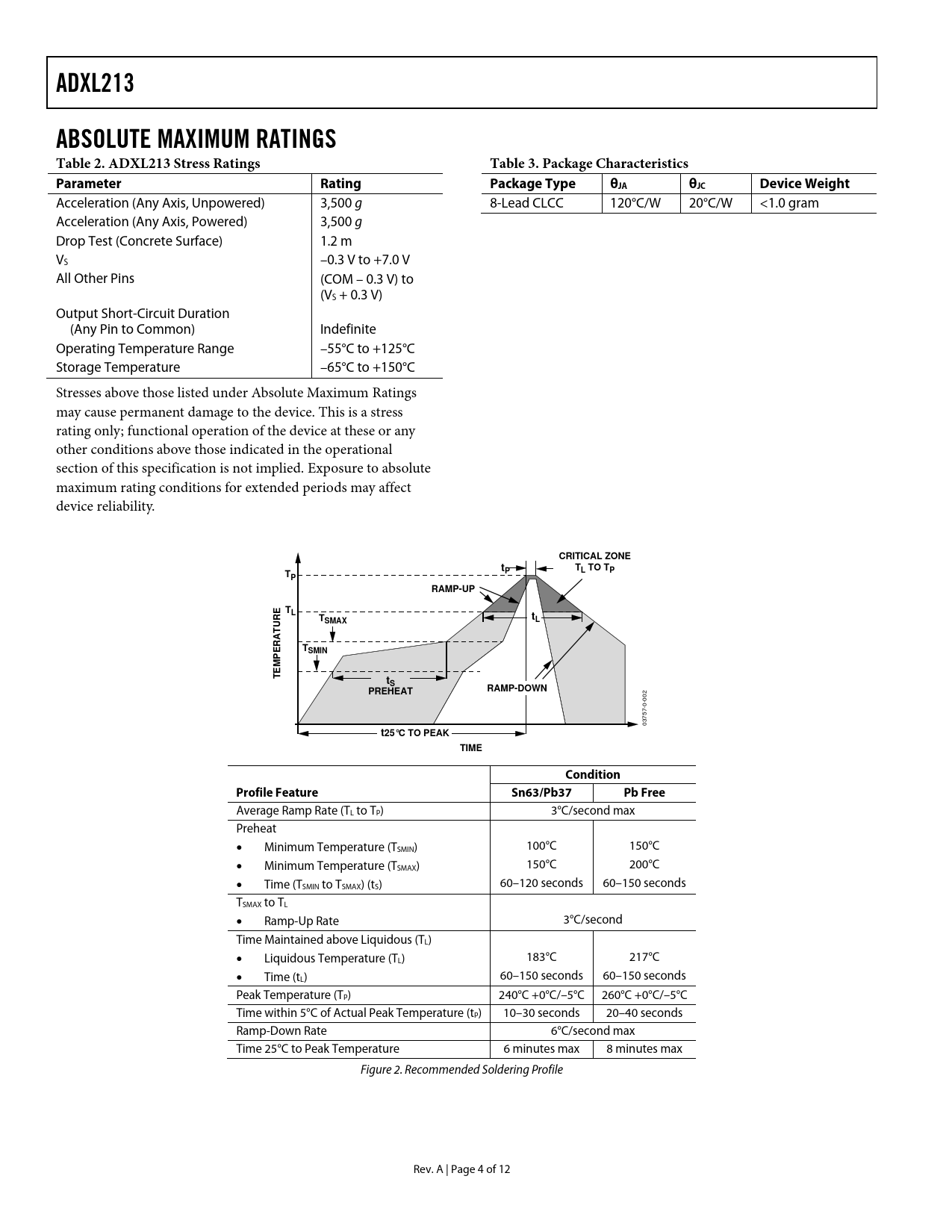 ADXL213 ABSOLUTE MAXIMUM RATINGS Table 2. ADXL213 Stress Ratings Table 3. Package Characteristics Parameter Rating Package Type θJA θJC Device Weight