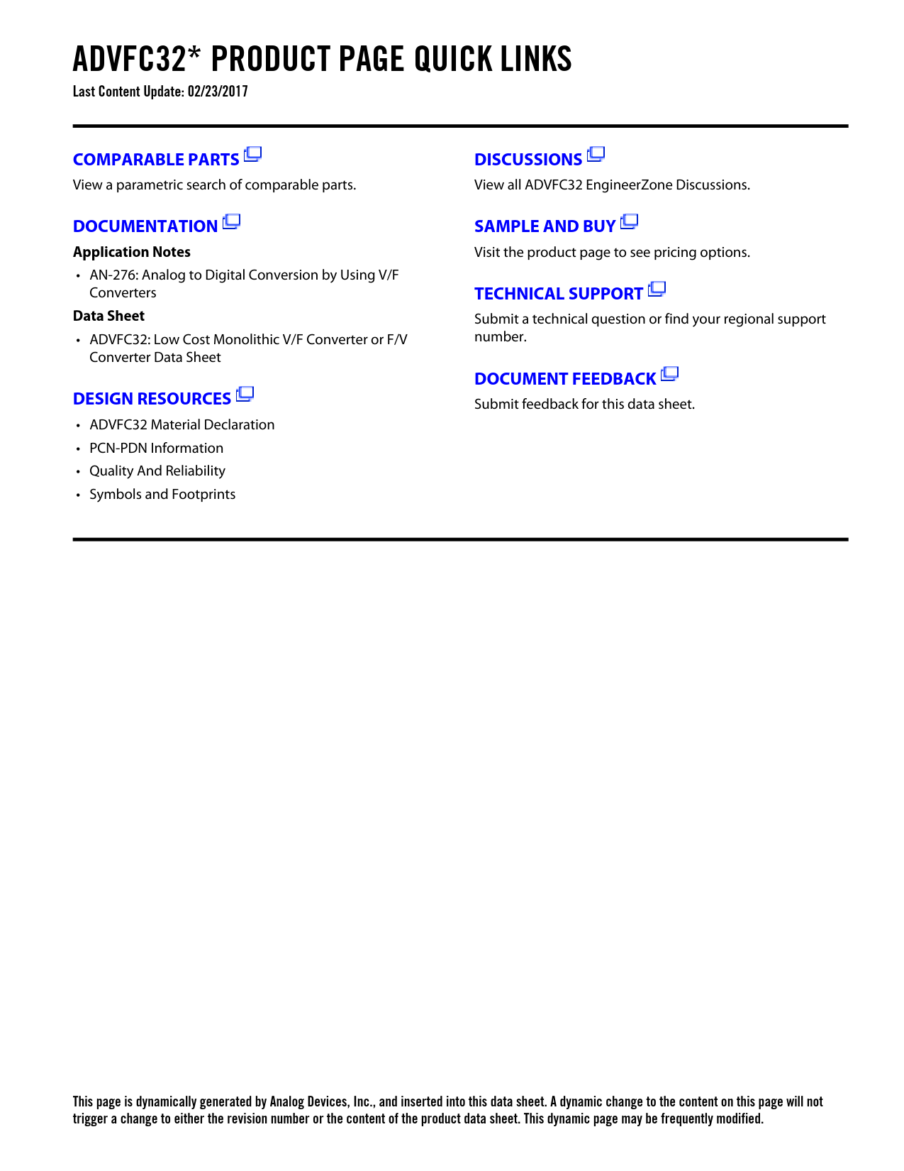 Submit a technical question or find your regional support • ADVFC32: Low Cost Monolithic V/F Converter or F/V number. Converter Data Sheet