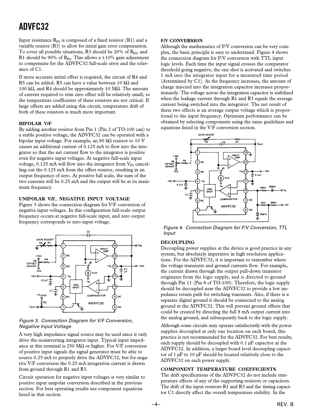 ADVFC32 F/V CONVERSION BIPOLAR V/F UNIPOLAR V/F, NEGATIVE INPUT VOLTAGE DECOUPLING COMPONENT TEMPERATURE COEFFICIENTS