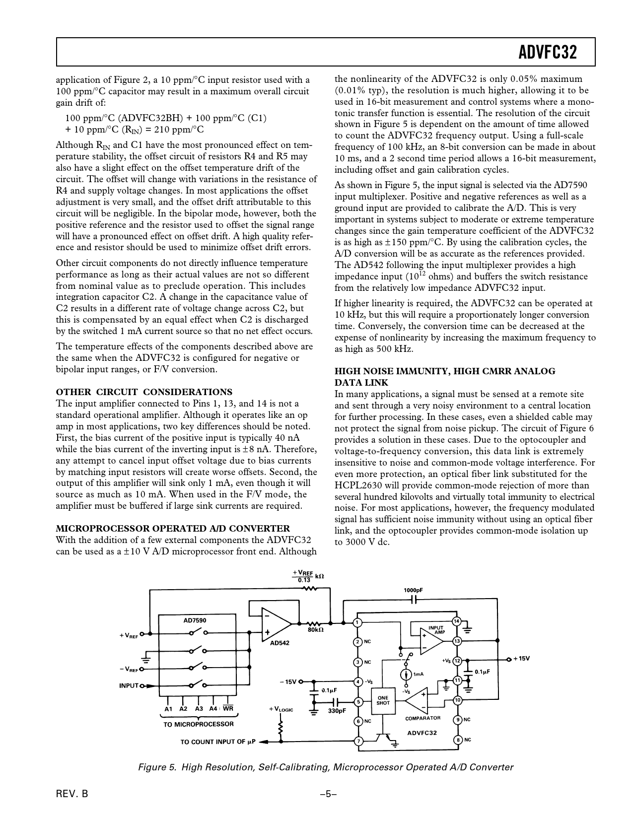 link, and the optocoupler provides common-mode isolation up With the addition of a few external components the ADVFC32 to 3000 V dc. can be used as a ± 10 V A/D microprocessor front end. Although Figure 5. High Resolution, Self-Calibrating, Microprocessor Operated A/D Converter REV. B –5–