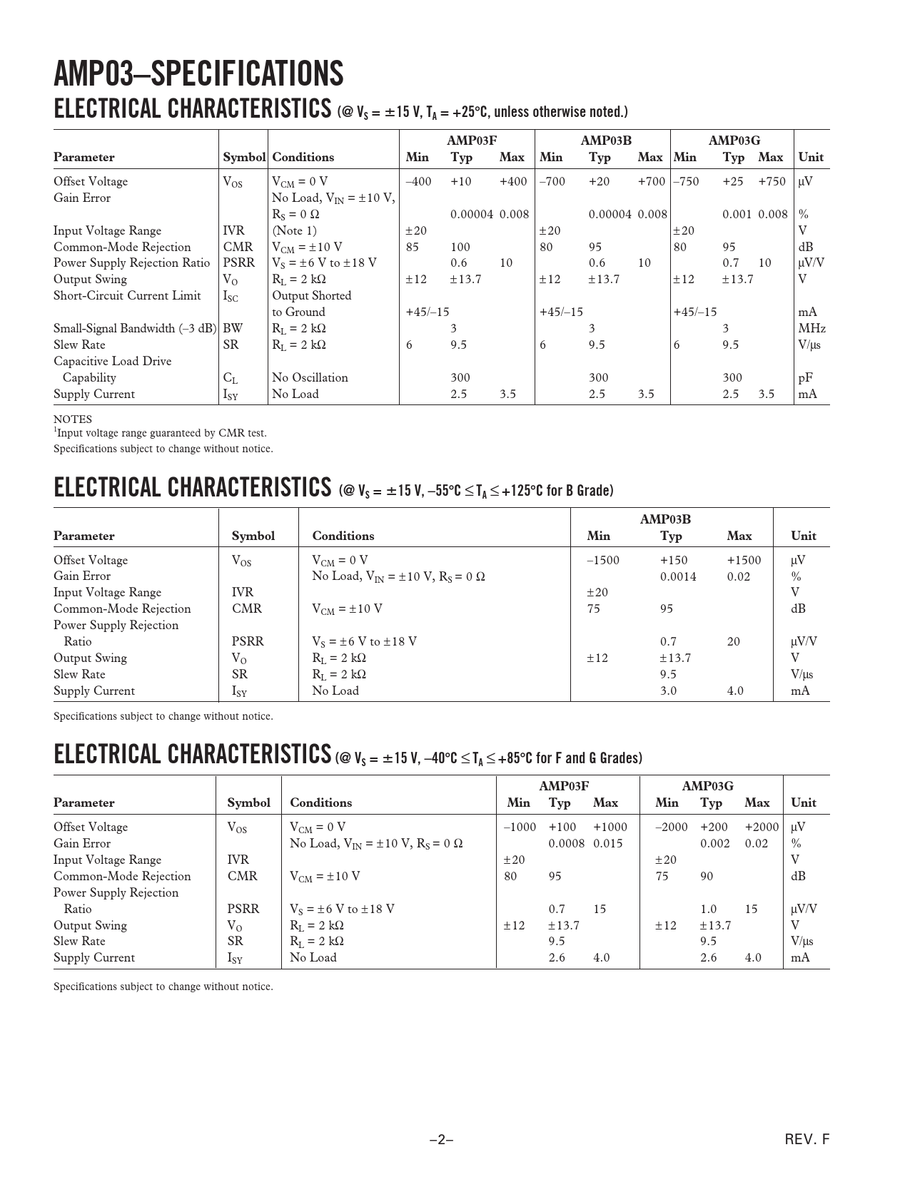 AMP03–SPECIFICATIONS ELECTRICAL CHARACTERISTICS (@ VS = ⴞ 15 V, TA = +25 ⴗ C, unless otherwise noted.)AMP03FAMP03BAMP03GParameterSymbol ConditionsMinTypMaxMinTypMax MinTypMaxUnit Offset Voltage VOS VCM = 0 V –400 +10 +400 –700 +20 +700 –750 +25 +750 µV Gain Error No Load, VIN = ± 10 V, RS = 0 Ω 0.00004 0.008 0.00004 0.008 0.001 0.008 % Input Voltage Range IVR (Note 1) ±20 ±20 ±20 V Common-Mode Rejection CMR VCM = ± 10 V 85 100 80 95 80 95 dB Power Supply Rejection Ratio PSRR VS = ± 6 V to ± 18 V 0.6 10 0.6 10 0.7 10 µV/V Output Swing VO RL = 2 kΩ ±12 ±13.7 ±12 ±13.7 ±12 ±13.7 V Short-Circuit Current Limit ISC Output Shorted to Ground +45/–15 +45/–15 +45/–15 mA Small-Signal Bandwidth (–3 dB) BW RL = 2 kΩ 3 3 3 MHz Slew Rate SR RL = 2 kΩ 6 9.5 6 9.5 6 9.5 V/µs Capacitive Load Drive Capability CL No Oscillation 300 300 300 pF Supply Current ISY No Load 2.5 3.5 2.5 3.5 2.5 3.5 mA NOTES 1Input voltage range guaranteed by CMR test. Specifications subject to change without notice. ELECTRICAL CHARACTERISTICS (@ VS = ⴞ 15 V, –55 ⴗ C ≤ TA ≤ +125 ⴗ C for B Grade)AMP03BParameterSymbolConditionsMinTypMaxUnit Offset Voltage VOS VCM = 0 V –1500 +150 +1500 µV Gain Error No Load, VIN = ± 10 V, RS = 0 Ω 0.0014 0.02 % Input Voltage Range IVR ±20 V Common-Mode Rejection CMR VCM = ± 10 V 75 95 dB Power Supply Rejection Ratio PSRR VS = ± 6 V to ± 18 V 0.7 20 µV/V Output Swing VO RL = 2 kΩ ±12 ±13.7 V Slew Rate SR RL = 2 kΩ 9.5 V/µs Supply Current ISY No Load 3.0 4.0 mA Specifications subject to change without notice. ELECTRICAL CHARACTERISTICS (@ VS = ⴞ 15 V, –40 ⴗ C ≤ TA ≤ +85 ⴗ C for F and G Grades)AMP03FAMP03GParameterSymbolConditionsMinTypMaxMinTypMaxUnit Offset Voltage VOS VCM = 0 V –1000 +100 +1000 –2000 +200 +2000 µV Gain Error No Load, VIN = ± 10 V, RS = 0 Ω 0.0008 0.015 0.002 0.02 % Input Voltage Range IVR ±20 ±20 V Common-Mode Rejection CMR VCM = ± 10 V 80 95 75 90 dB Power Supply Rejection Ratio PSRR VS = ± 6 V to ± 18 V 0.7 15 1.0 15 µV/V Output Swing VO RL = 2 kΩ ±12 ±13.7 ±12 ±13.7 V Slew Rate SR RL = 2 kΩ 9.5 9.5 V/µs Supply Current ISY No Load 2.6 4.0 2.6 4.0 mA Specifications subject to change without notice. –2– REV. F Document Outline FEATURES APPLICATIONS GENERAL DESCRIPTION FUNCTIONAL BLOCK DIAGRAM PIN CONNECTIONS SPECIFICATIONS WAFER TEST LIMITS ABSOLUTE MAXIMUM RATINGS ORDERING GUIDE DICE CHARACTERISTICS BURN-IN CIRCUIT SLEW RATE TEST CIRCUIT Typical Performance Characteristics APPLICATION CIRCUITS APPLICATIONS INFORMATION MAINTAINING COMMON-MODE REJECTION OUTLINE DIMENSIONS Revision History
