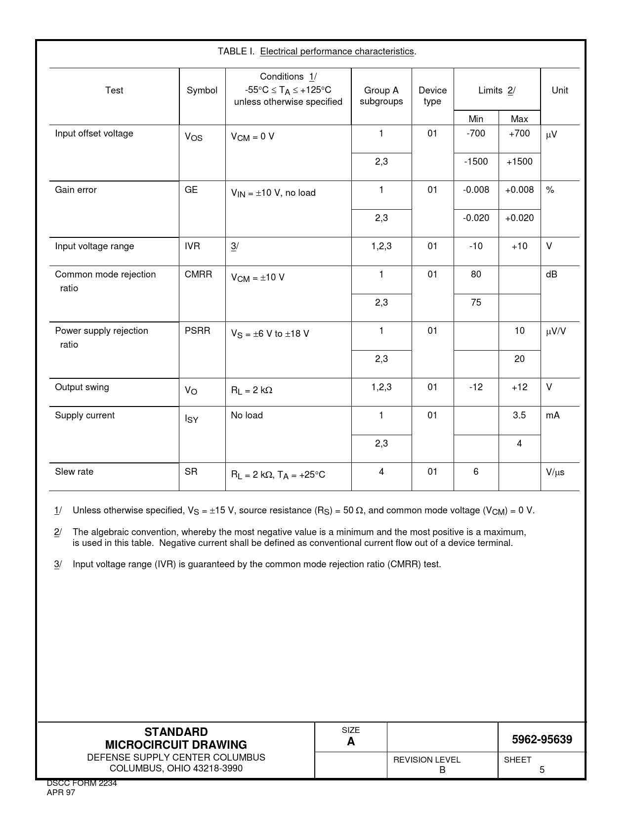 TABLE I. Electrical performance characteristics. Conditions 1/ Test Symbol -55°C ≤ TA ≤ +125°C Group A Device Limits 2/ Unit unless otherwise specified subgroups type Min Max Input offset voltage VOS VCM = 0 V 1 01 -700 +700 µV 2,3 -1500 +1500 Gain error GE VIN = ±10 V, no load 1 01 -0.008 +0.008 % 2,3 -0.020 +0.020 Input voltage range IVR 3/ 1,2,3 01 -10 +10 V Common mode rejection CMRR VCM = ±10 V 1 01 80 dB ratio 2,3 75 Power supply rejection PSRR VS = ±6 V to ±18 V 1 01 10 µV/V ratio 2,3 20 Output swing VO RL = 2 kΩ 1,2,3 01 -12 +12 V Supply current ISY No load 1 01 3.5 mA 2,3 4 Slew rate SR RL = 2 kΩ, TA = +25°C 4 01 6 V/µs 1/ Unless otherwise specified, VS = ±15 V, source resistance (RS) = 50 Ω, and common mode voltage (VCM) = 0 V. 2/ The algebraic convention, whereby the most negative value is a minimum and the most positive is a maximum, is used in this table. Negative current shall be defined as conventional current flow out of a device terminal. 3/ Input voltage range (IVR) is guaranteed by the common mode rejection ratio (CMRR) test.