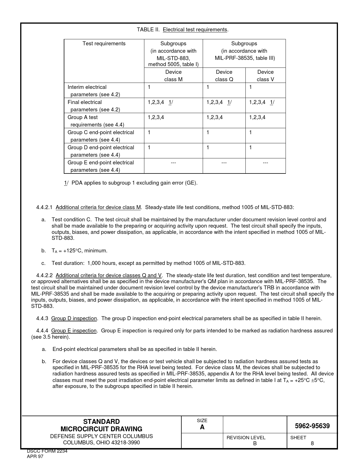TABLE II. Electrical test requirements. Test requirements Subgroups Subgroups (in accordance with (in accordance with MIL-STD-883, MIL-PRF-38535, table III) method 5005, table I) Device Device Device class M class Q class V Interim electrical 1 1 1 parameters (see 4.2) Final electrical 1,2,3,4 1/ 1,2,3,4 1/ 1,2,3,4 1/ parameters (see 4.2) Group A test 1,2,3,4 1,2,3,4 1,2,3,4 requirements (see 4.4) Group C end-point electrical 1 1 1 parameters (see 4.4) Group D end-point electrical 1 1 1 parameters (see 4.4) Group E end-point electrical --- --- --- parameters (see 4.4) 1/ PDA applies to subgroup 1 excluding gain error (GE). 4.4.2.1 Additional criteria for device class M. Steady-state life test conditions, method 1005 of MIL-STD-883: a. Test condition C. The test circuit shall be maintained by the manufacturer under document revision level control and shall be made available to the preparing or acquiring activity upon request. The test circuit shall specify the inputs, outputs, biases, and power dissipation, as applicable, in accordance with the intent specified in method 1005 of MIL- STD-883. b. TA = +125°C, minimum. c. Test duration: 1,000 hours, except as permitted by method 1005 of MIL-STD-883. 4.4.2.2 Additional criteria for device classes Q and V. The steady-state life test duration, test condition and test temperature, or approved alternatives shall be as specified in the device manufacturer's QM plan in accordance with MIL-PRF-38535. The test circuit shall be maintained under document revision level control by the device manufacturer's TRB in accordance with MIL-PRF-38535 and shall be made available to the acquiring or preparing activity upon request. The test circuit shall specify the inputs, outputs, biases, and power dissipation, as applicable, in accordance with the intent specified in method 1005 of MIL- STD-883. 4.4.3 Group D inspection. The group D inspection end-point electrical parameters shall be as specified in table II herein. 4.4.4 Group E inspection. Group E inspection is required only for parts intended to be marked as radiation hardness assured (see 3.5 herein). a. End-point electrical parameters shall be as specified in table II herein. b. For device classes Q and V, the devices or test vehicle shall be subjected to radiation hardness assured tests as specified in MIL-PRF-38535 for the RHA level being tested. For device class M, the devices shall be subjected to radiation hardness assured tests as specified in MIL-PRF-38535, appendix A for the RHA level being tested. All device classes must meet the post irradiation end-point electrical parameter limits as defined in table I at TA = +25°C ±5°C, after exposure, to the subgroups specified in table II herein.
