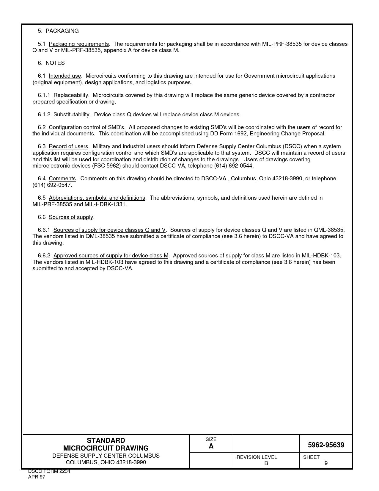 5. PACKAGING 5.1 Packaging requirements. The requirements for packaging shall be in accordance with MIL-PRF-38535 for device classes Q and V or MIL-PRF-38535, appendix A for device class M. 6. NOTES 6.1 Intended use. Microcircuits conforming to this drawing are intended for use for Government microcircuit applications (original equipment), design applications, and logistics purposes. 6.1.1 Replaceability. Microcircuits covered by this drawing will replace the same generic device covered by a contractor prepared specification or drawing. 6.1.2 Substitutability. Device class Q devices will replace device class M devices. 6.2 Configuration control of SMD's. All proposed changes to existing SMD's will be coordinated with the users of record for the individual documents. This coordination will be accomplished using DD Form 1692, Engineering Change Proposal. 6.3 Record of users. Military and industrial users should inform Defense Supply Center Columbus (DSCC) when a system application requires configuration control and which SMD's are applicable to that system. DSCC will maintain a record of users and this list will be used for coordination and distribution of changes to the drawings. Users of drawings covering microelectronic devices (FSC 5962) should contact DSCC-VA, telephone (614) 692-0544. 6.4 Comments. Comments on this drawing should be directed to DSCC-VA , Columbus, Ohio 43218-3990, or telephone (614) 692-0547. 6.5 Abbreviations, symbols, and definitions. The abbreviations, symbols, and definitions used herein are defined in MIL-PRF-38535 and MIL-HDBK-1331. 6.6 Sources of supply. 6.6.1 Sources of supply for device classes Q and V. Sources of supply for device classes Q and V are listed in QML-38535. The vendors listed in QML-38535 have submitted a certificate of compliance (see 3.6 herein) to DSCC-VA and have agreed to this drawing. 6.6.2 Approved sources of supply for device class M. Approved sources of supply for class M are listed in MIL-HDBK-103. The vendors listed in MIL-HDBK-103 have agreed to this drawing and a certificate of compliance (see 3.6 herein) has been submitted to and accepted by DSCC-VA.