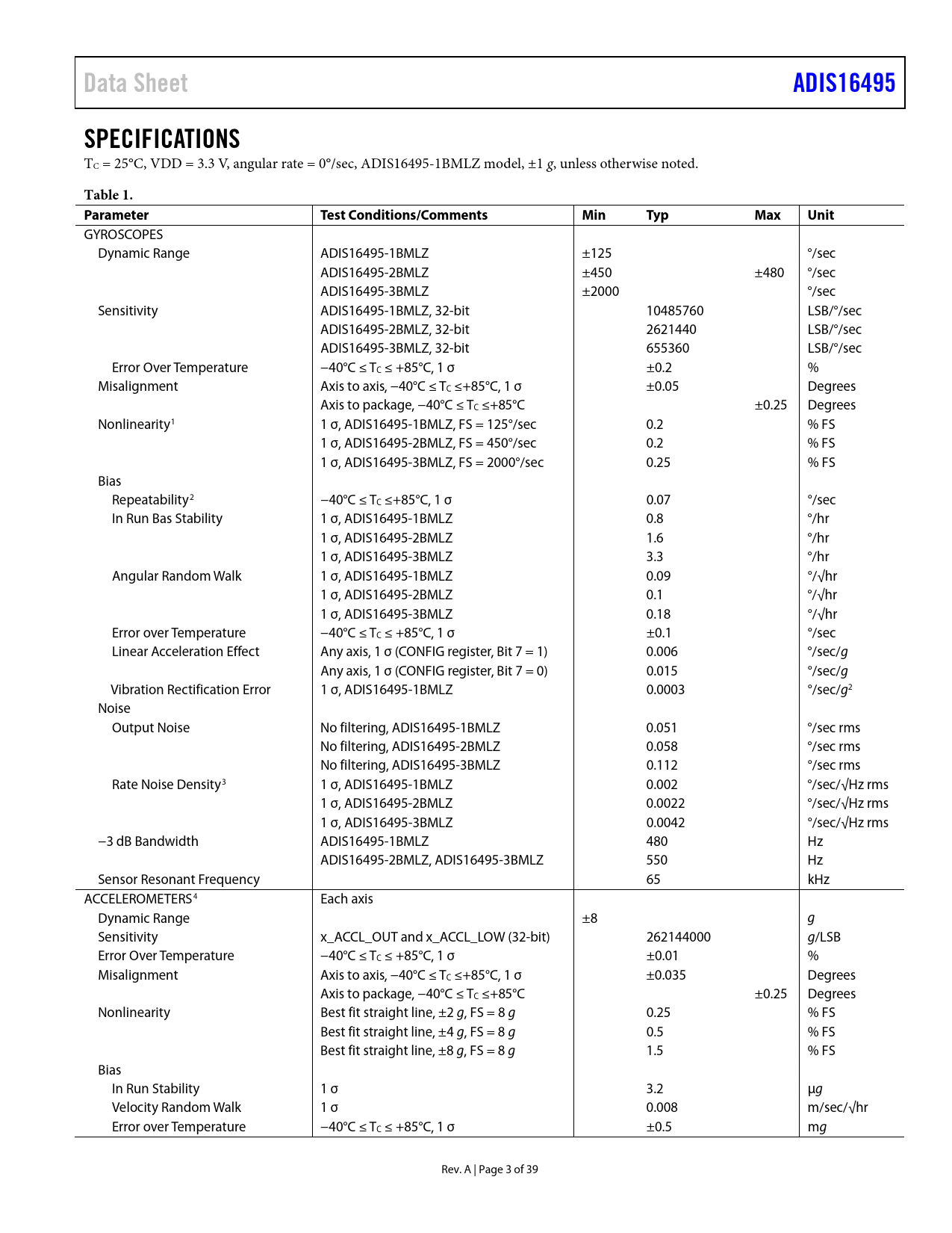 Data Sheet. ADIS16495. SPECIFICATIONS. Table 1. Parameter. Test Conditions/Comments. Min. Typ. Max. Unit
