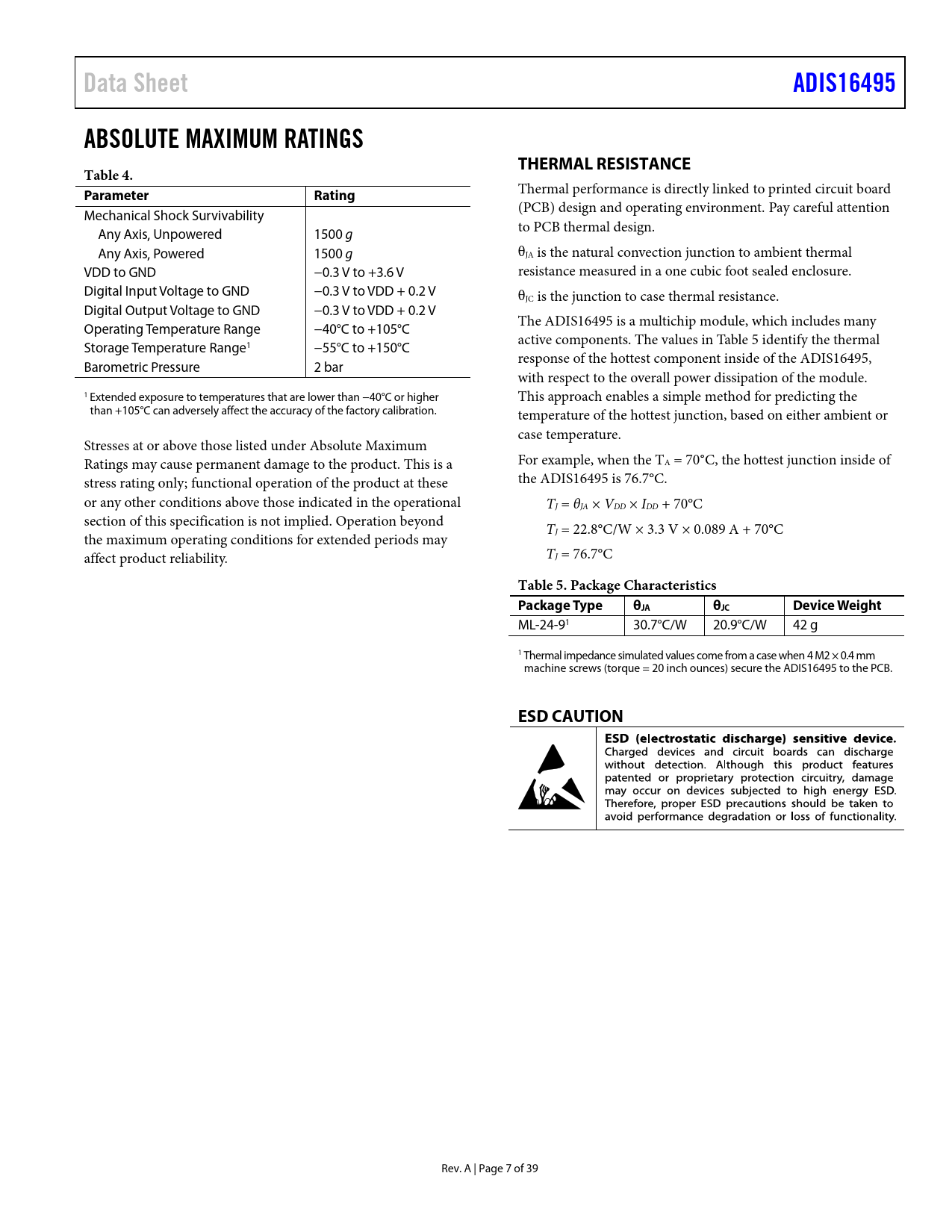 Data Sheet ADIS16495 ABSOLUTE MAXIMUM RATINGS THERMAL RESISTANCE Table 4 Parameter Rating Table 5 Package Characteristics