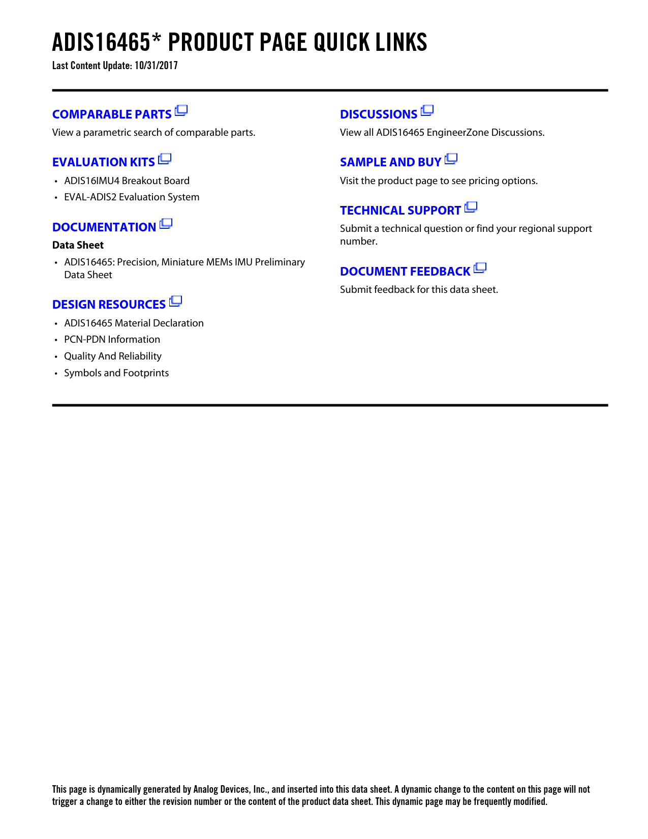 ADIS16465* PRODUCT PAGE QUICK LINKS Last Content Update: 10/31/2017COMPARABLE PARTSDISCUSSIONS View a parametric search of comparable parts. View all ADIS16465 EngineerZone Discussions. EVALUATION KITSSAMPLE AND BUY • ADIS16IMU4 Breakout Board Visit the product page to see pricing options. • EVAL-ADIS2 Evaluation System TECHNICAL SUPPORTDOCUMENTATION Submit a technical question or find your regional support Data Sheet number. • ADIS16465: Precision, Miniature MEMs IMU Preliminary Data Sheet DOCUMENT FEEDBACK Submit feedback for this data sheet. DESIGN RESOURCES • ADIS16465 Material Declaration • PCN-PDN Information • Quality And Reliability • Symbols and Footprints This page is dynamically generated by Analog Devices, Inc., and inserted into this data sheet. A dynamic change to the content on this page will not trigger a change to either the revision number or the content of the product data sheet. This dynamic page may be frequently modified.