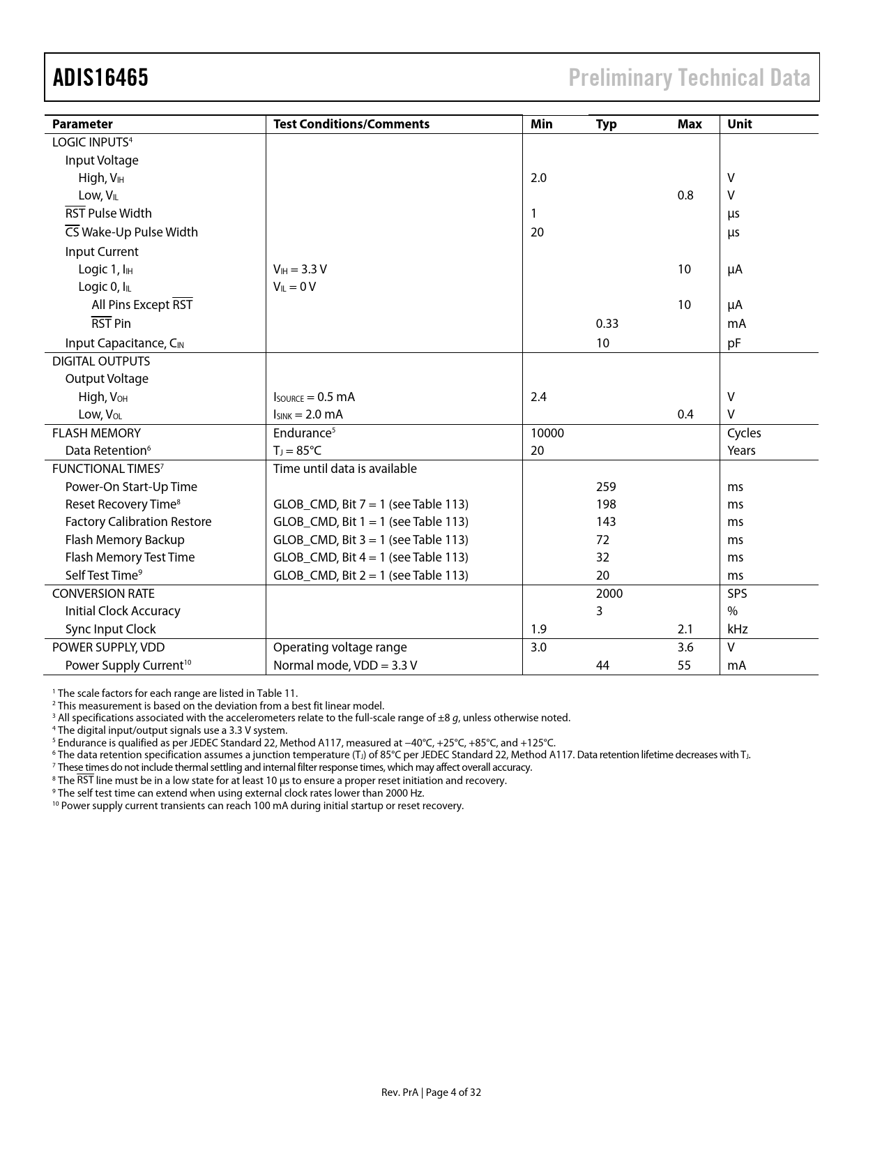 ADIS16465Preliminary Technical DataParameter TestConditions/CommentsMinTypMaxUnit LOGIC INPUTS4 Input Voltage High, VIH 2.0 V Low, VIL 0.8 V RST Pulse Width 1 μs CS Wake-Up Pulse Width 20 μs Input Current Logic 1, IIH VIH = 3.3 V 10 μA Logic 0, IIL VIL = 0 V All Pins Except RST 10 μA RST Pin 0.33 mA Input Capacitance, CIN 10 pF DIGITAL OUTPUTS Output Voltage High, VOH ISOURCE = 0.5 mA 2.4 V Low, VOL ISINK = 2.0 mA 0.4 V FLASH MEMORY Endurance5 10000 Cycles Data Retention6 TJ = 85°C 20 Years FUNCTIONAL TIMES7 Time until data is available Power-On Start-Up Time 259 ms Reset Recovery Time8 GLOB_CMD, Bit 7 = 1 (see Table 113) 198 ms Factory Calibration Restore GLOB_CMD, Bit 1 = 1 (see Table 113) 143 ms Flash Memory Backup GLOB_CMD, Bit 3 = 1 (see Table 113) 72 ms Flash Memory Test Time GLOB_CMD, Bit 4 = 1 (see Table 113) 32 ms Self Test Time9 GLOB_CMD, Bit 2 = 1 (see Table 113) 20 ms CONVERSION RATE 2000 SPS Initial Clock Accuracy 3 % Sync Input Clock 1.9 2.1 kHz POWER SUPPLY, VDD Operating voltage range 3.0 3.6 V Power Supply Current10 Normal mode, VDD = 3.3 V 44 55 mA 1 The scale factors for each range are listed in Table 11. 2 This measurement is based on the deviation from a best fit linear model. 3 All specifications associated with the accelerometers relate to the full-scale range of ±8 g, unless otherwise noted. 4 The digital input/output signals use a 3.3 V system. 5 Endurance is qualified as per JEDEC Standard 22, Method A117, measured at −40°C, +25°C, +85°C, and +125°C. 6 The data retention specification assumes a junction temperature (TJ) of 85°C per JEDEC Standard 22, Method A117. Data retention lifetime decreases with TJ. 7 These times do not include thermal settling and internal filter response times, which may affect overall accuracy. 8 The RST line must be in a low state for at least 10 μs to ensure a proper reset initiation and recovery. 9 The self test time can extend when using external clock rates lower than 2000 Hz. 10 Power supply current transients can reach 100 mA during initial startup or reset recovery. Rev. PrA | Page 4 of 32
