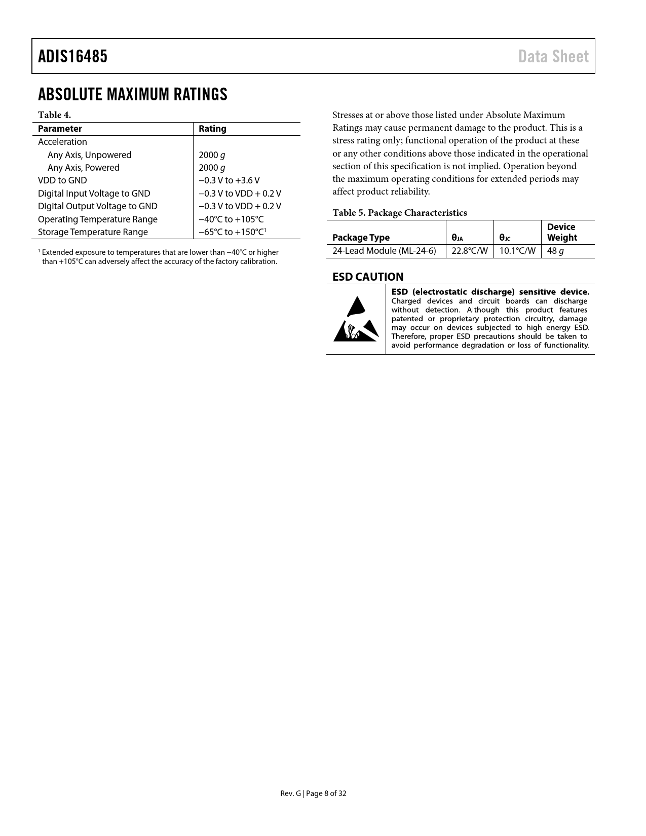ADIS16485 Data Sheet ABSOLUTE MAXIMUM RATINGS Table 4 Parameter Rating Table 5 Package Characteristics Device Package Type
