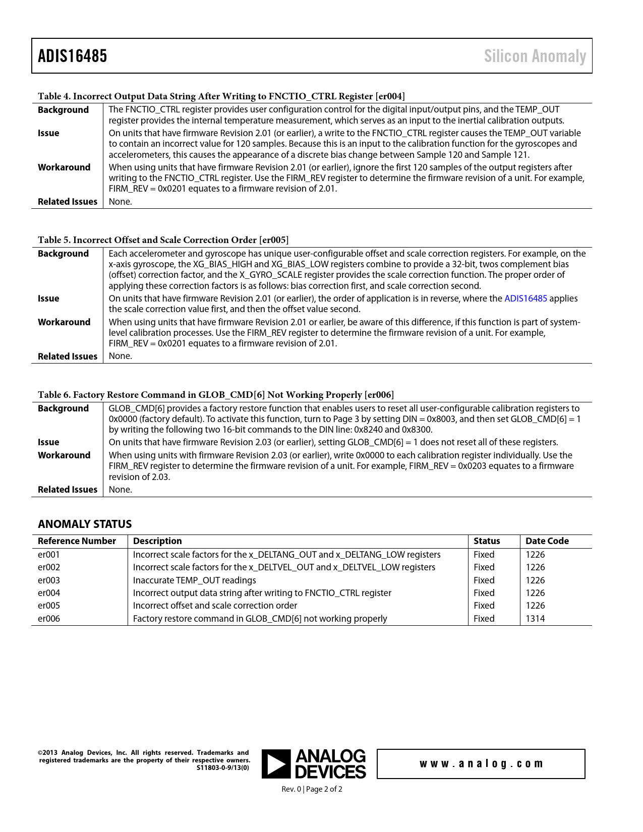 | Páginas / Página | 2 / 2 — ADIS16485. Silicon Anomaly. Table 4. Incorrect Output Data String After … |