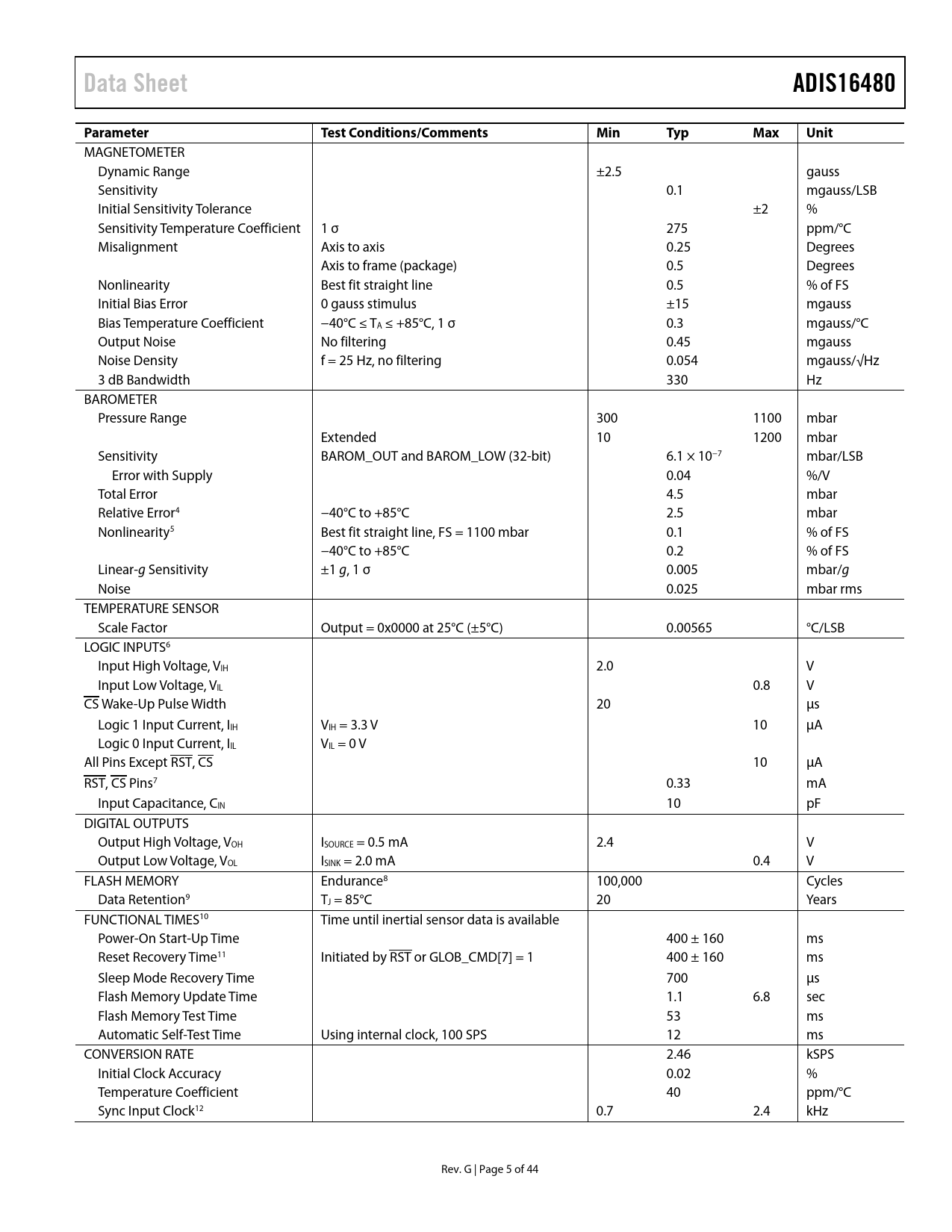 link to page 7 link to page 7 link to page 7 link to page 7 link to page 7 link to page 7 link to page 7 link to page 7 link to page 7 Data SheetADIS16480ParameterTest Conditions/CommentsMinTypMaxUnit MAGNETOMETER Dynamic Range ±2.5 gauss Sensitivity 0.1 mgauss/LSB Initial Sensitivity Tolerance ±2 % Sensitivity Temperature Coefficient 1 σ 275 ppm/°C Misalignment Axis to axis 0.25 Degrees Axis to frame (package) 0.5 Degrees Nonlinearity Best fit straight line 0.5 % of FS Initial Bias Error 0 gauss stimulus ±15 mgauss Bias Temperature Coefficient −40°C ≤ TA ≤ +85°C, 1 σ 0.3 mgauss/°C Output Noise No filtering 0.45 mgauss Noise Density f = 25 Hz, no filtering 0.054 mgauss/√Hz 3 dB Bandwidth 330 Hz BAROMETER Pressure Range 300 1100 mbar Extended 10 1200 mbar Sensitivity BAROM_OUT and BAROM_LOW (32-bit) 6.1 × 10−7 mbar/LSB Error with Supply 0.04 %/V Total Error 4.5 mbar Relative Error4 −40°C to +85°C 2.5 mbar Nonlinearity5 Best fit straight line, FS = 1100 mbar 0.1 % of FS −40°C to +85°C 0.2 % of FS Linear-g Sensitivity ±1 g, 1 σ 0.005 mbar/g Noise 0.025 mbar rms TEMPERATURE SENSOR Scale Factor Output = 0x0000 at 25°C (±5°C) 0.00565 °C/LSB LOGIC INPUTS6 Input High Voltage, VIH 2.0 V Input Low Voltage, VIL 0.8 V CS Wake-Up Pulse Width 20 µs Logic 1 Input Current, IIH VIH = 3.3 V 10 µA Logic 0 Input Current, IIL VIL = 0 V All Pins Except RST, CS 10 µA RST, CS Pins7 0.33 mA Input Capacitance, CIN 10 pF DIGITAL OUTPUTS Output High Voltage, VOH ISOURCE = 0.5 mA 2.4 V Output Low Voltage, VOL ISINK = 2.0 mA 0.4 V FLASH MEMORY Endurance8 100,000 Cycles Data Retention9 TJ = 85°C 20 Years FUNCTIONAL TIMES10 Time until inertial sensor data is available Power-On Start-Up Time 400 ± 160 ms Reset Recovery Time11 Initiated by RST or GLOB_CMD[7] = 1 400 ± 160 ms Sleep Mode Recovery Time 700 µs Flash Memory Update Time 1.1 6.8 sec Flash Memory Test Time 53 ms Automatic Self-Test Time Using internal clock, 100 SPS 12 ms CONVERSION RATE 2.46 kSPS Initial Clock Accuracy 0.02 % Temperature Coefficient 40 ppm/°C Sync Input Clock12 0.7 2.4 kHz Rev. G | Page 5 of 44 Document Outline Features Applications General Description Functional Block Diagram Revision History Specifications Timing Specifications Timing Diagrams Absolute Maximum Ratings ESD Caution Pin Configuration and Function Descriptions Typical Performance Characteristics Basic Operation Register Structure SPI Communication Device Configuration Dual Memory Structure Reading Sensor Data User Registers Output Data Registers Inertial Sensor Data Format Rotation Rate (Gyroscope) Acceleration Delta Angles Delta Velocity Magnetometers Roll, Pitch, Yaw Angles Initial Conditions Quaternion Euler Angles Rotation Matrix Data Barometer Internal Temperature Status/Alarm Indicators Firmware Revision Product Identification Digital Signal Processing Gyroscopes/Accelerometers Averaging/Decimation Filter Magnetometer/Barometer FIR Filter Banks Filter Memory Organization Default Filter Performance Extended Kalman Filter Algorithm Covariance Terms Reference Frame Reference Transformation Matrix Declination Adaptive Operation Adaptive EKF Enable Bit Automatic EKF Divergence Reset Control Bit Gyroscope Fade Control Bit Body Frame/Local Navigation Frame Bit Orientation Format Control Bit Magnetometer Disable Control Bit Gravity Removal Control Bit Linear Acceleration/Magnetic Disturbance Detection Calibration Gyroscopes Manual Bias Correction Manual Sensitivity Correction Linear Acceleration on Effect on Gyroscope Bias Accelerometers Manual Bias Correction Manual Sensitivity Correction Magnetometers Hard Iron Correction Soft Iron Correction Matrix Barometers Restoring Factory Calibration Point of Percussion Alignment Alarms Static Alarm Use Dynamic Alarm Use Alarm Example System Controls Global Commands Software Reset Automatic Self-Test Memory Management Flash Memory Test General-Purpose I/O Data-Ready Indicator Input Sync/Clock Control General-Purpose I/O Control Power Management General-Purpose Registers Real-Time Clock Configuration/Data Applications Information Mounting Tips Evaluation Tools Breakout Board, ADIS16IMU1/PCB PC-Based Evaluation, EVAL-ADIS2 Power Supply Considerations Outline Dimensions Ordering Guide