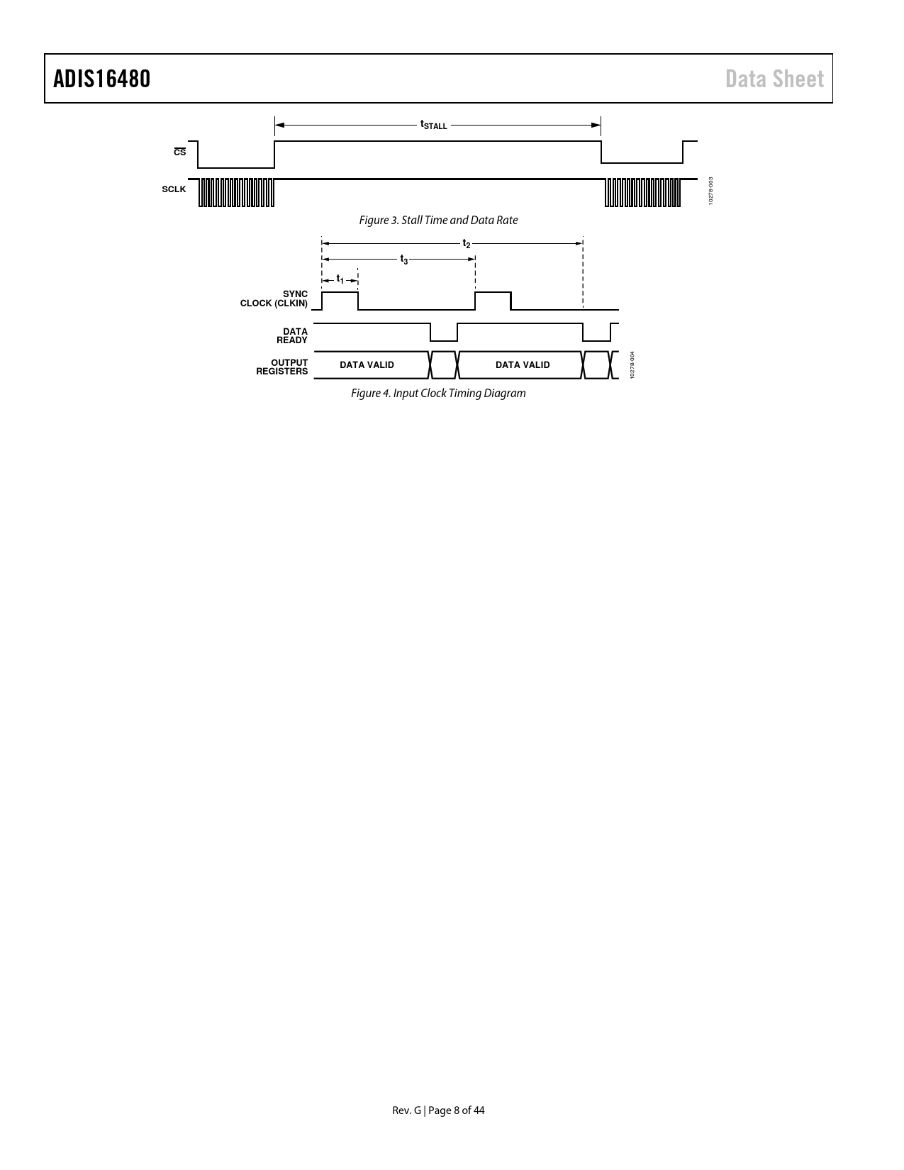 ADIS16480Data SheettSTALLCS 003 SCLK 10278- Figure 3. Stall Time and Data Rate t2t3t1SYNCCLOCK (CLKIN)DATAREADY 004 OUTPUTDATA VALIDDATA VALIDREGISTERS 10278- Figure 4. Input Clock Timing Diagram Rev. G | Page 8 of 44 Document Outline Features Applications General Description Functional Block Diagram Revision History Specifications Timing Specifications Timing Diagrams Absolute Maximum Ratings ESD Caution Pin Configuration and Function Descriptions Typical Performance Characteristics Basic Operation Register Structure SPI Communication Device Configuration Dual Memory Structure Reading Sensor Data User Registers Output Data Registers Inertial Sensor Data Format Rotation Rate (Gyroscope) Acceleration Delta Angles Delta Velocity Magnetometers Roll, Pitch, Yaw Angles Initial Conditions Quaternion Euler Angles Rotation Matrix Data Barometer Internal Temperature Status/Alarm Indicators Firmware Revision Product Identification Digital Signal Processing Gyroscopes/Accelerometers Averaging/Decimation Filter Magnetometer/Barometer FIR Filter Banks Filter Memory Organization Default Filter Performance Extended Kalman Filter Algorithm Covariance Terms Reference Frame Reference Transformation Matrix Declination Adaptive Operation Adaptive EKF Enable Bit Automatic EKF Divergence Reset Control Bit Gyroscope Fade Control Bit Body Frame/Local Navigation Frame Bit Orientation Format Control Bit Magnetometer Disable Control Bit Gravity Removal Control Bit Linear Acceleration/Magnetic Disturbance Detection Calibration Gyroscopes Manual Bias Correction Manual Sensitivity Correction Linear Acceleration on Effect on Gyroscope Bias Accelerometers Manual Bias Correction Manual Sensitivity Correction Magnetometers Hard Iron Correction Soft Iron Correction Matrix Barometers Restoring Factory Calibration Point of Percussion Alignment Alarms Static Alarm Use Dynamic Alarm Use Alarm Example System Controls Global Commands Software Reset Automatic Self-Test Memory Management Flash Memory Test General-Purpose I/O Data-Ready Indicator Input Sync/Clock Control General-Purpose I/O Control Power Management General-Purpose Registers Real-Time Clock Configuration/Data Applications Information Mounting Tips Evaluation Tools Breakout Board, ADIS16IMU1/PCB PC-Based Evaluation, EVAL-ADIS2 Power Supply Considerations Outline Dimensions Ordering Guide
