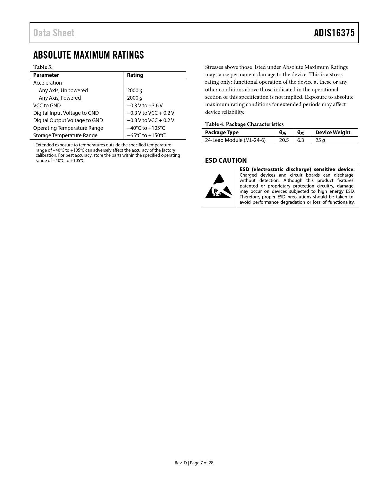 Data Sheet ADIS16375 ABSOLUTE MAXIMUM RATINGS Table 3 Parameter Rating Table 4 Package Characteristics Package Type θJC