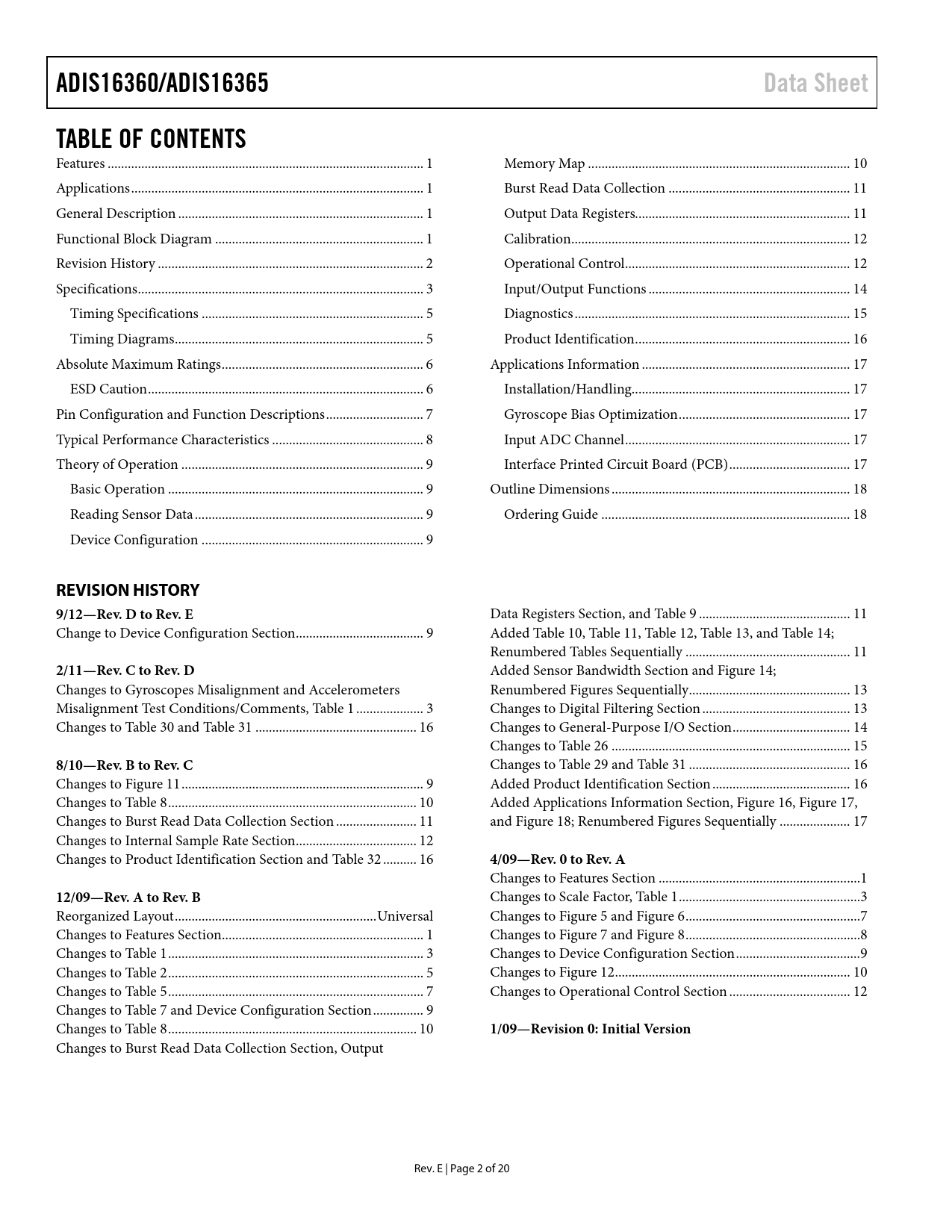 ADIS16360/ADIS16365. Data Sheet. TABLE OF CONTENTS. REVISION HISTORY 9/12—Rev. D to Rev. E. 2/11—Rev. C to Rev. D