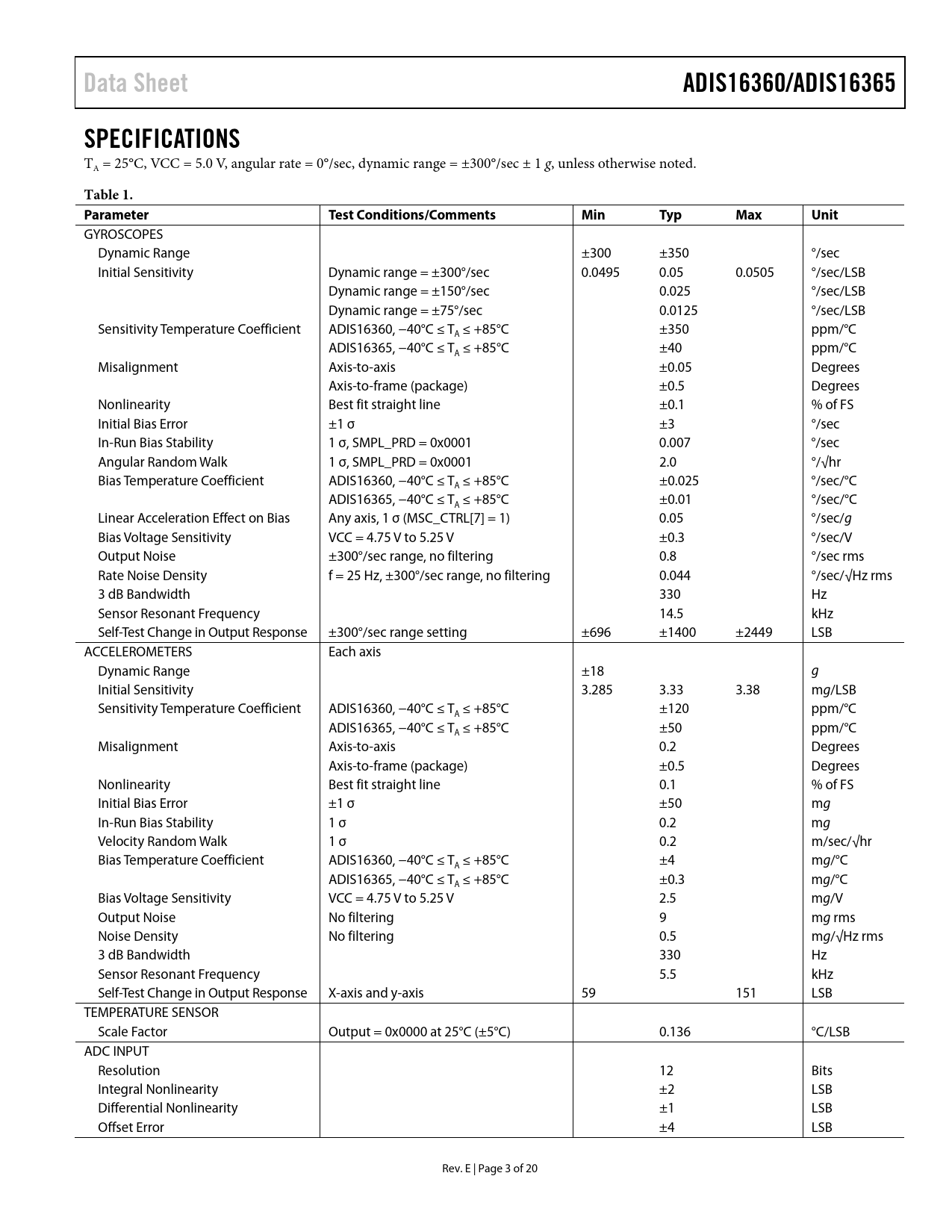 Data Sheet. ADIS16360/ADIS16365. SPECIFICATIONS. Table 1. Parameter. Test Conditions/Comments. Min. Typ. Max. Unit