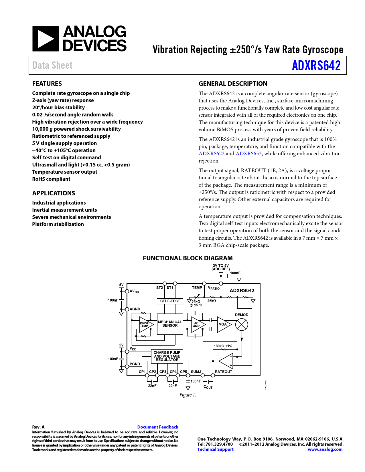 Two digital self-test inputs electromechanically excite the sensor to test proper operation of both the sensor and the signal condi- tioning circuits. The ADXRS642 is available in a 7 mm × 7 mm × 3 mm BGA chip-scale package.