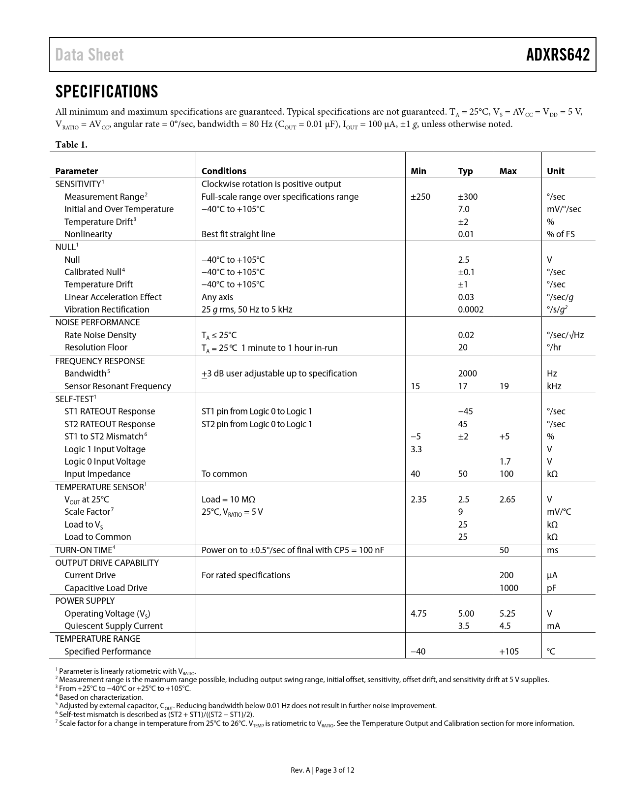 Páginas / Página13 / 4 — Data Sheet. ADXRS642. SPECIFICATIONS. Table 1. Parameter. Conditions. …