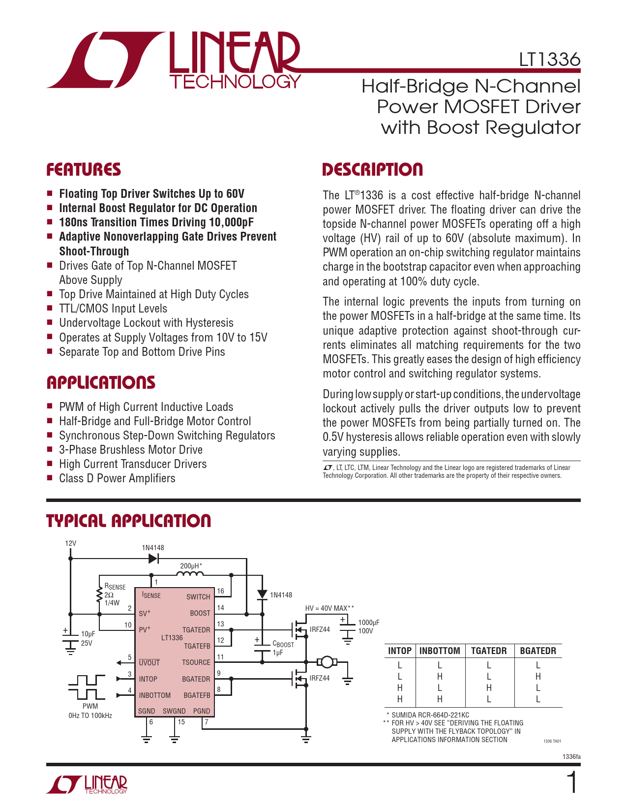 5 11 UVOUT TSOURCE L L L L 3 9 INTOP BGATEDR IRFZ44 L H L H 4 8 H L H L INBOTTOM BGATEFB H H L L PWM SGND SWGND PGND 0Hz TO 100kHz * SUMIDA RCR-664D-221KC 6 15 7 ** FOR HV > 40V SEE “DERIVING THE FLOATING SUPPLY WITH THE FLYBACK TOPOLOGY” IN APPLICATIONS INFORMATION SECTION 1336 TA01 1336fa 1 Document Outline Features Applications Description Typical Application Absolute Maximum Ratings Pin Configuration Order Information Electrical Characteristics Typical Performance Characteristics Pin Functions Functional Diagram Test Circuit Timing Diagram Operation Applications Information Typical Applications Package Description Revision History Typical Application Related Parts
