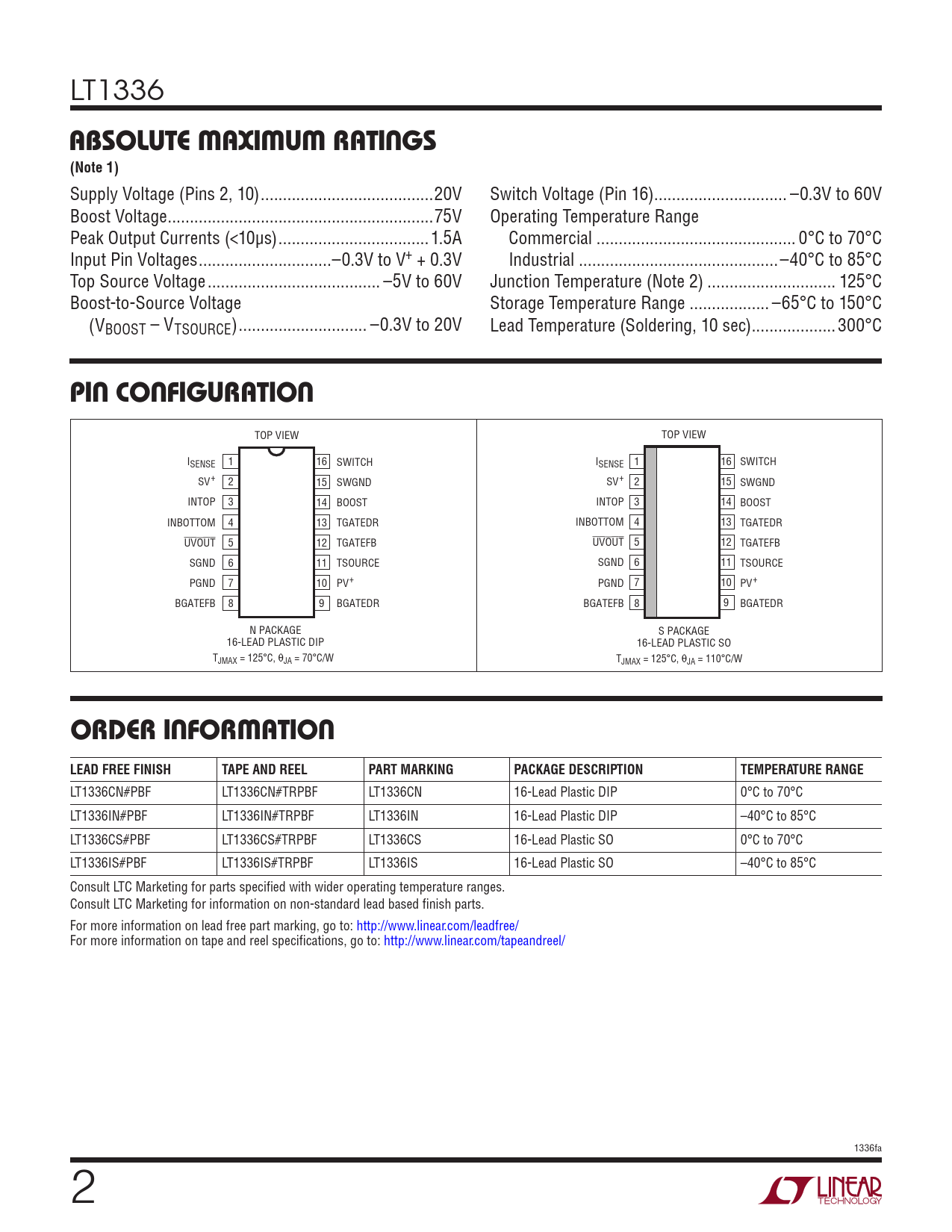 TOP VIEW TOP VIEW ISENSE 1 16 SWITCH ISENSE 1 16 SWITCH SV+ 2 15 SWGND SV+ 2 15 SWGND INTOP 3 14 BOOST INTOP 3 14 BOOST INBOTTOM 4 13 TGATEDR INBOTTOM 4 13 TGATEDR UVOUT 5 12 TGATEFB UVOUT 5 12 TGATEFB SGND 6 11 TSOURCE SGND 6 11 TSOURCE PGND 7 10 PV+ PGND 7 10 PV+ BGATEFB 8 9 BGATEDR BGATEFB 8 9 BGATEDR N PACKAGE S PACKAGE 16-LEAD PLASTIC DIP 16-LEAD PLASTIC SO TJMAX = 125°C, θJA = 70°C/W TJMAX = 125°C, θJA = 110°C/W