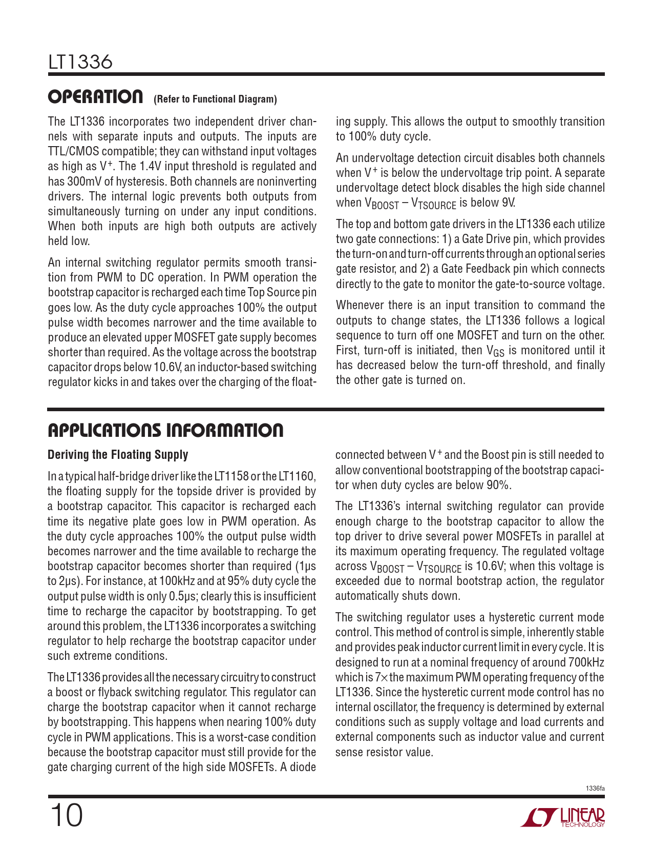 LT1336 operaTion (Refer to Functional Diagram) The LT1336 incorporates two independent driver chan- ing supply. This allows the output to smoothly transition nels with separate inputs and outputs. The inputs are to 100% duty cycle. TTL/CMOS compatible; they can withstand input voltages An undervoltage detection circuit disables both channels as high as V+. The 1.4V input threshold is regulated and when V+ is below the undervoltage trip point. A separate has 300mV of hysteresis. Both channels are noninverting undervoltage detect block disables the high side channel drivers. The internal logic prevents both outputs from when VBOOST – VTSOURCE is below 9V. simultaneously turning on under any input conditions. When both inputs are high both outputs are actively The top and bottom gate drivers in the LT1336 each utilize held low. two gate connections: 1) a Gate Drive pin, which provides the turn-on and turn-off currents through an optional series An internal switching regulator permits smooth transi- gate resistor, and 2) a Gate Feedback pin which connects tion from PWM to DC operation. In PWM operation the directly to the gate to monitor the gate-to-source voltage. bootstrap capacitor is recharged each time Top Source pin goes low. As the duty cycle approaches 100% the output Whenever there is an input transition to command the pulse width becomes narrower and the time available to outputs to change states, the LT1336 follows a logical produce an elevated upper MOSFET gate supply becomes sequence to turn off one MOSFET and turn on the other. shorter than required. As the voltage across the bootstrap First, turn-off is initiated, then VGS is monitored until it capacitor drops below 10.6V, an inductor-based switching has decreased below the turn-off threshold, and finally regulator kicks in and takes over the charging of the float- the other gate is turned on. applicaTions inForMaTion Deriving the Floating Supply connected between V+ and the Boost pin is still needed to allow conventional bootstrapping of the bootstrap capaci- In a typical half-bridge driver like the LT1158 or the LT1160, tor when duty cycles are below 90%. the floating supply for the topside driver is provided by a bootstrap capacitor. This capacitor is recharged each The LT1336’s internal switching regulator can provide time its negative plate goes low in PWM operation. As enough charge to the bootstrap capacitor to allow the the duty cycle approaches 100% the output pulse width top driver to drive several power MOSFETs in parallel at becomes narrower and the time available to recharge the its maximum operating frequency. The regulated voltage bootstrap capacitor becomes shorter than required (1µs across VBOOST – VTSOURCE is 10.6V; when this voltage is to 2µs). For instance, at 100kHz and at 95% duty cycle the exceeded due to normal bootstrap action, the regulator output pulse width is only 0.5µs; clearly this is insufficient automatically shuts down. time to recharge the capacitor by bootstrapping. To get The switching regulator uses a hysteretic current mode around this problem, the LT1336 incorporates a switching control. This method of control is simple, inherently stable regulator to help recharge the bootstrap capacitor under and provides peak inductor current limit in every cycle. It is such extreme conditions. designed to run at a nominal frequency of around 700kHz The LT1336 provides al the necessary circuitry to construct which is 7× the maximum PWM operating frequency of the a boost or flyback switching regulator. This regulator can LT1336. Since the hysteretic current mode control has no charge the bootstrap capacitor when it cannot recharge internal oscillator, the frequency is determined by external by bootstrapping. This happens when nearing 100% duty conditions such as supply voltage and load currents and cycle in PWM applications. This is a worst-case condition external components such as inductor value and current because the bootstrap capacitor must still provide for the sense resistor value. gate charging current of the high side MOSFETs. A diode 1336fa 10 Document Outline Features Applications Description Typical Application Absolute Maximum Ratings Pin Configuration Order Information Electrical Characteristics Typical Performance Characteristics Pin Functions Functional Diagram Test Circuit Timing Diagram Operation Applications Information Typical Applications Package Description Revision History Typical Application Related Parts