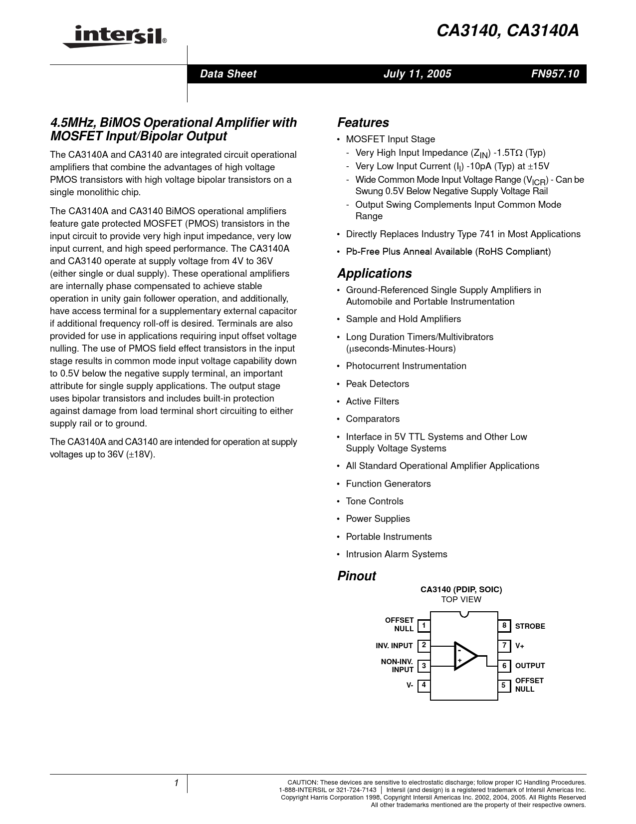 CA3140, CA3140A ® Data SheetJuly 11, 2005FN957.104.5MHz, BiMOS Operational Amplifier withFeaturesMOSFET Input/Bipolar Output • MOSFET Input Stage The CA3140A and CA3140 are integrated circuit operational - Very High Input Impedance (ZIN) -1.5TΩ (Typ) amplifiers that combine the advantages of high voltage - Very Low Input Current (Il) -10pA (Typ) at ±15V PMOS transistors with high voltage bipolar transistors on a - Wide Common Mode Input Voltage Range (VlCR) - Can be single monolithic chip. Swung 0.5V Below Negative Supply Voltage Rail - Output Swing Complements Input Common Mode The CA3140A and CA3140 BiMOS operational amplifiers Range feature gate protected MOSFET (PMOS) transistors in the input circuit to provide very high input impedance, very low • Directly Replaces Industry Type 741 in Most Applications input current, and high speed performance. The CA3140A • Pb-Free Plus Anneal Available (RoHS Compliant) and CA3140 operate at supply voltage from 4V to 36V (either single or dual supply). These operational amplifiers Applications are internally phase compensated to achieve stable • Ground-Referenced Single Supply Amplifiers in operation in unity gain follower operation, and additionally, Automobile and Portable Instrumentation have access terminal for a supplementary external capacitor if additional frequency roll-off is desired. Terminals are also • Sample and Hold Amplifiers provided for use in applications requiring input offset voltage • Long Duration Timers/Multivibrators nulling. The use of PMOS field effect transistors in the input (µseconds-Minutes-Hours) stage results in common mode input voltage capability down • Photocurrent Instrumentation to 0.5V below the negative supply terminal, an important attribute for single supply applications. The output stage • Peak Detectors uses bipolar transistors and includes built-in protection • Active Filters against damage from load terminal short circuiting to either supply rail or to ground. • Comparators • Interface in 5V TTL Systems and Other Low The CA3140A and CA3140 are intended for operation at supply Supply Voltage Systems voltages up to 36V (±18V). • All Standard Operational Amplifier Applications • Function Generators • Tone Controls • Power Supplies • Portable Instruments • Intrusion Alarm Systems PinoutCA3140 (PDIP, SOIC) TOP VIEW OFFSET18STROBENULLINV. INPUT27V+-NON-INV.+36OUTPUTINPUTOFFSETV-45NULL 1 CAUTION: These devices are sensitive to electrostatic discharge; follow proper IC Handling Procedures. 1-888-INTERSIL or 321-724-7143 | Intersil (and design) is a registered trademark of Intersil Americas Inc. Copyright Harris Corporation 1998, Copyright Intersil Americas Inc. 2002, 2004, 2005. All Rights Reserved All other trademarks mentioned are the property of their respective owners.