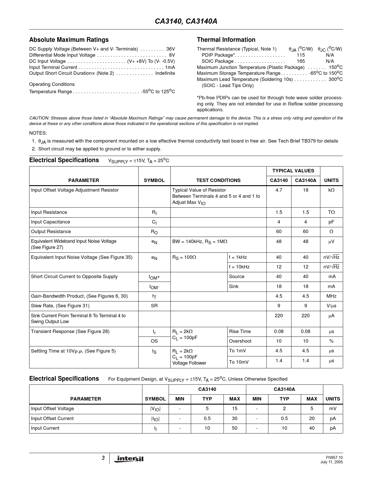 CA3140, CA3140A. Absolute Maximum Ratings. Thermal Information. Electrical Specifications. TYPICAL VALUES. PARAMETER. SYMBOL