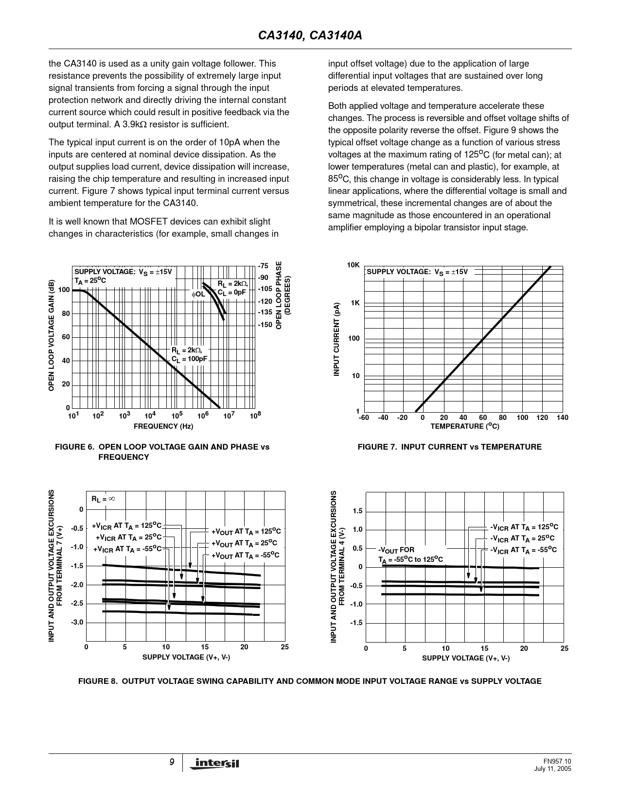 CA3140, CA3140A. -75. 10K. SUPPLY VOLTAGE: VS =. 15V. SUPPLY VOLTAGE: V. S =. -90. A = 25oC. RL = 2k. (dB 100. -105. L = 0pF. -120. OOP. AIN. -135. E G