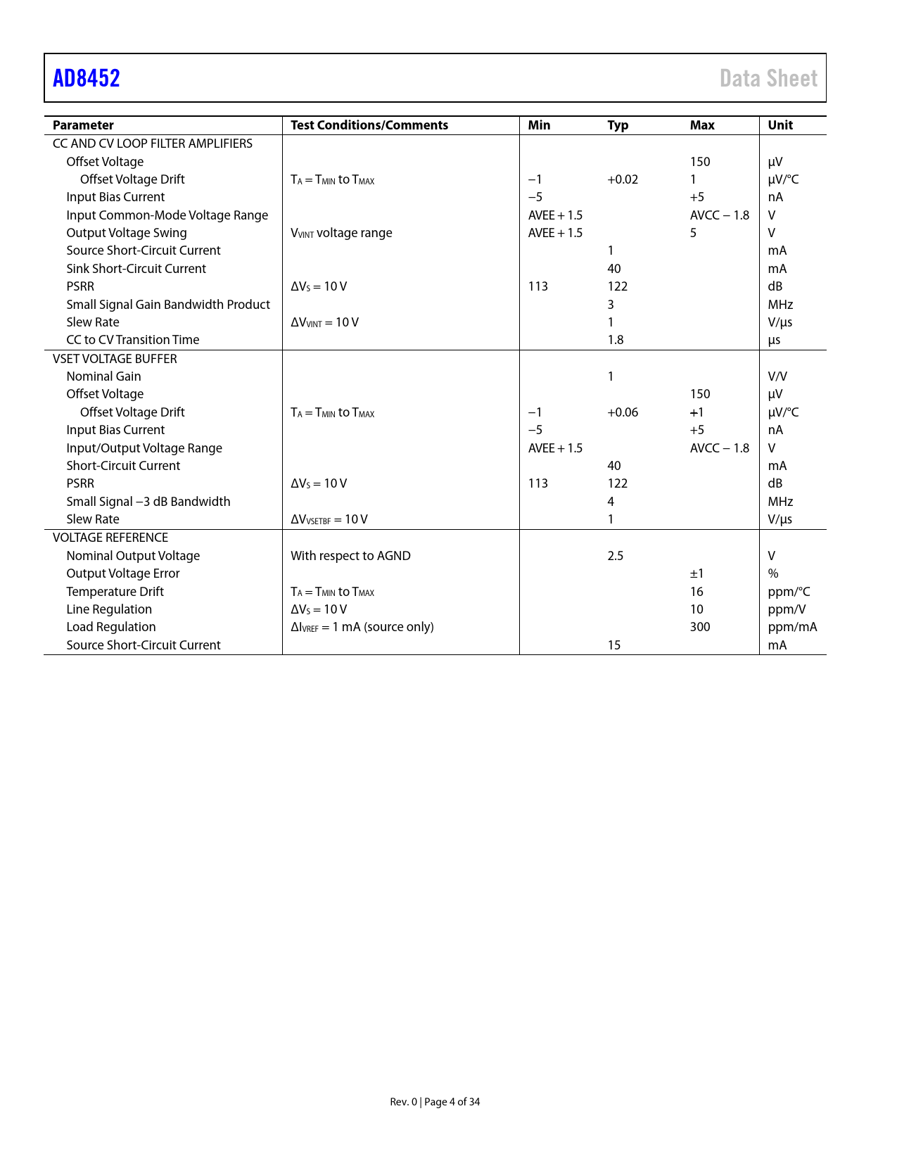 Páginas / Página35 / 5 — AD8452. Data Sheet. Parameter. Test Conditions/Comments. Min. Typ. Max. …