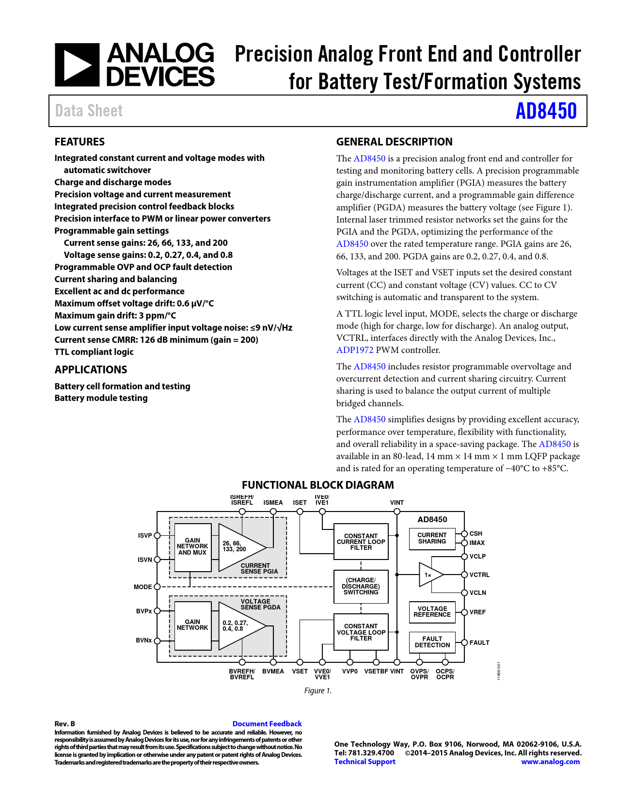 Precision Analog Front End and Control er for Battery Test/Formation Systems Data Sheet AD8450 FEATURES GENERAL DESCRIPTION Integrated constant current and voltage modes with