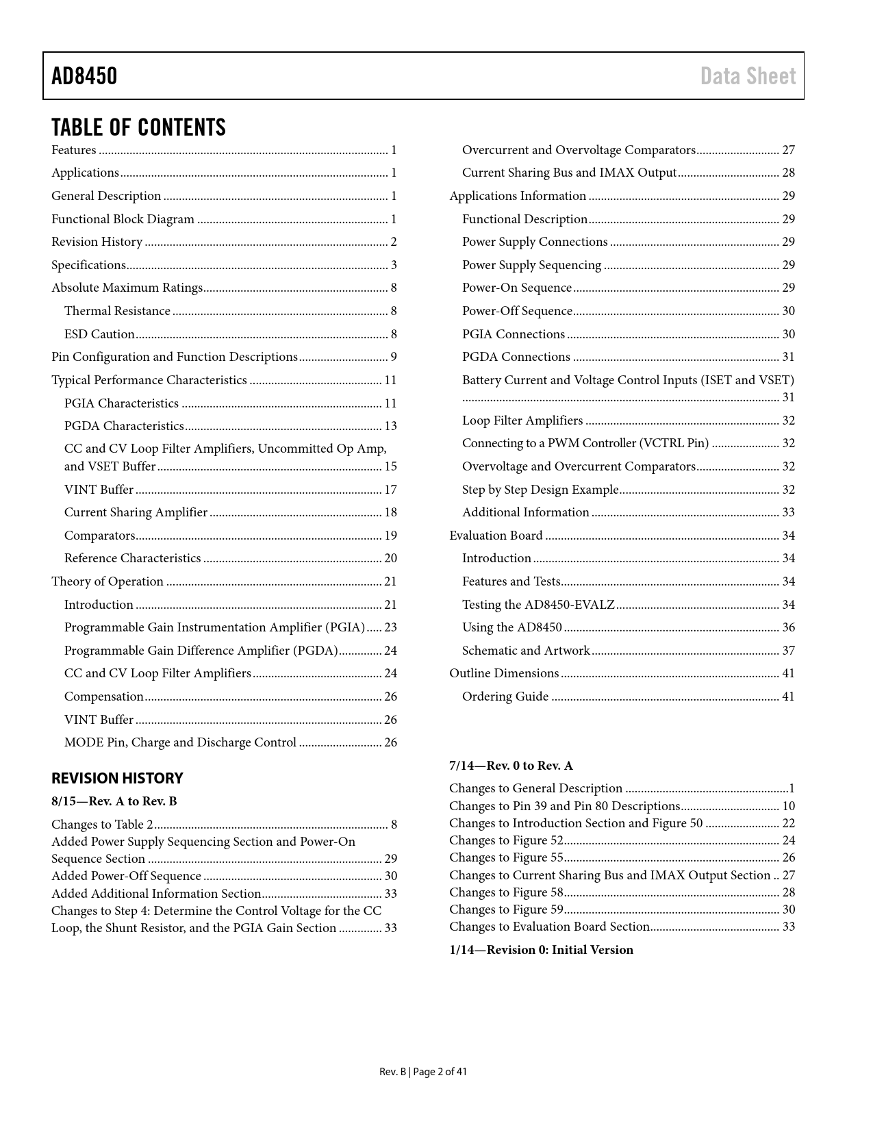 Páginas / Página42 / 3 — AD8450. Data Sheet. TABLE OF CONTENTS. 7/14—Rev. 0 to Rev. A. REVISION …