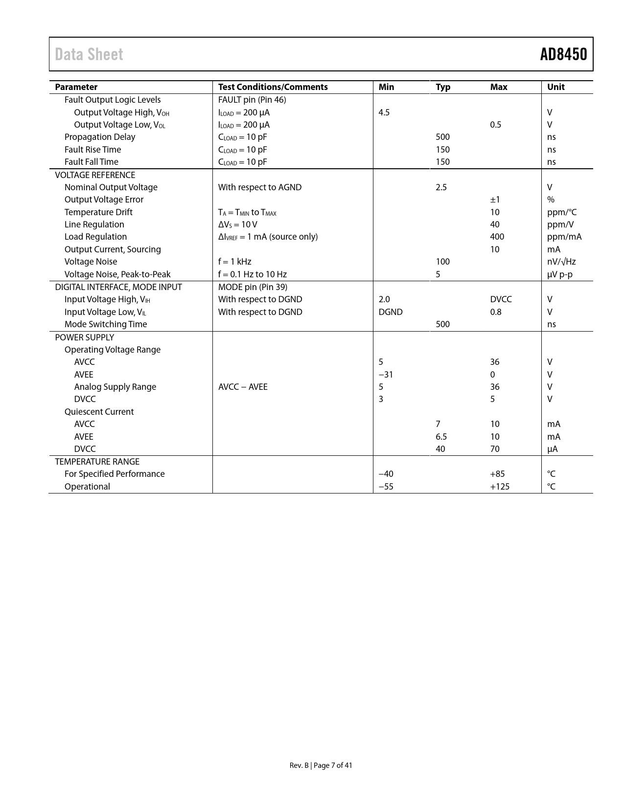 Páginas / Página42 / 8 — Data Sheet. AD8450. Parameter. Test Conditions/Comments. Min. Typ. Max. …