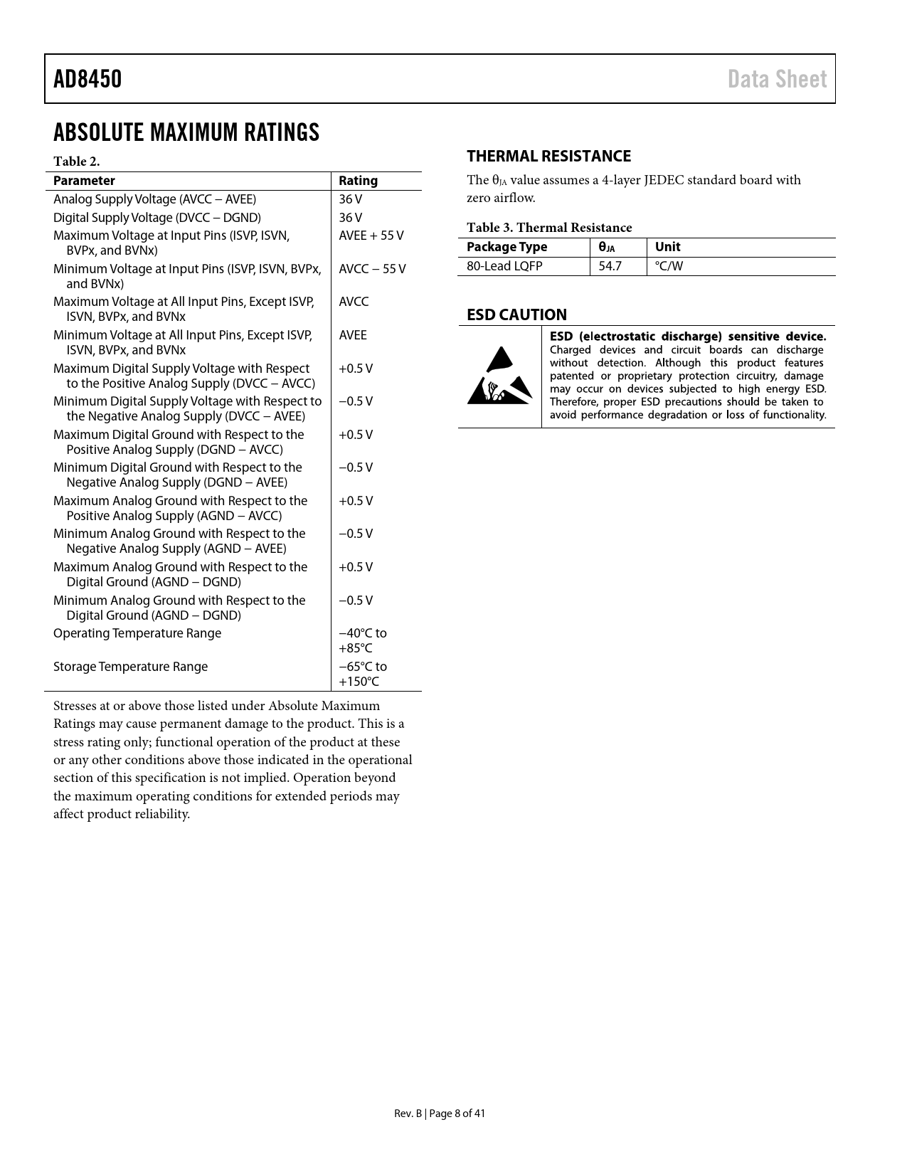 AD8450. Data Sheet. ABSOLUTE MAXIMUM RATINGS Table 2. THERMAL RESISTANCE. Parameter. Rating. Table 3. Thermal Resistance