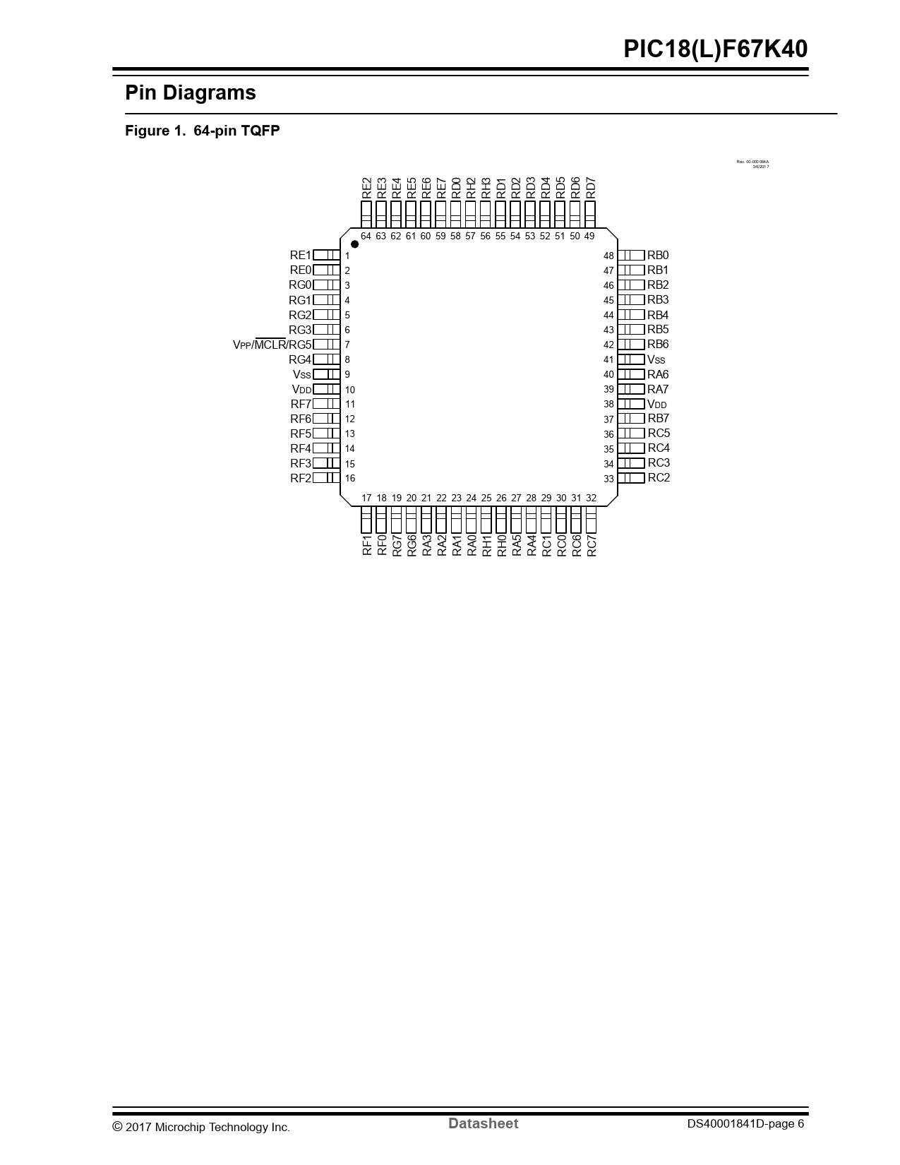 | Páginas / Página | 879 / 6 — PIC18(L)F67K40. Pin Diagrams. Figure 1. 64-pin TQFP. Datasheet |