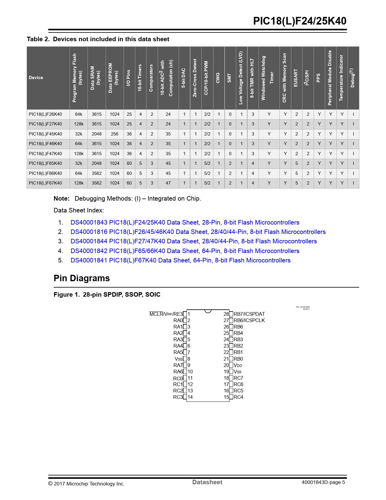 Debugging Methods: (I) – Integrated on Chip. Data Sheet Index: 1. DS40001843 PIC18(L)F24/25K40 Data Sheet, 28-Pin, 8-bit Flash Microcontrollers 2. DS40001816 PIC18(L)F26/45/46K40 Data Sheet, 28/40/44-Pin, 8-bit Flash Microcontrollers 3. DS40001844 PIC18(L)F27/47K40 Data Sheet, 28/40/44-Pin, 8-bit Flash Microcontrollers 4. DS40001842 PIC18(L)F65/66K40 Data Sheet, 64-Pin, 8-bit Flash Microcontrollers 5. Filena DS40001841 PIC18(L)F67K40 Data Sheet, 64-Pin, 8-bit Flash Microcontrollers me: 00-000028A.vsd Title: 28-pin DIP Last Edit: 3/6/2017