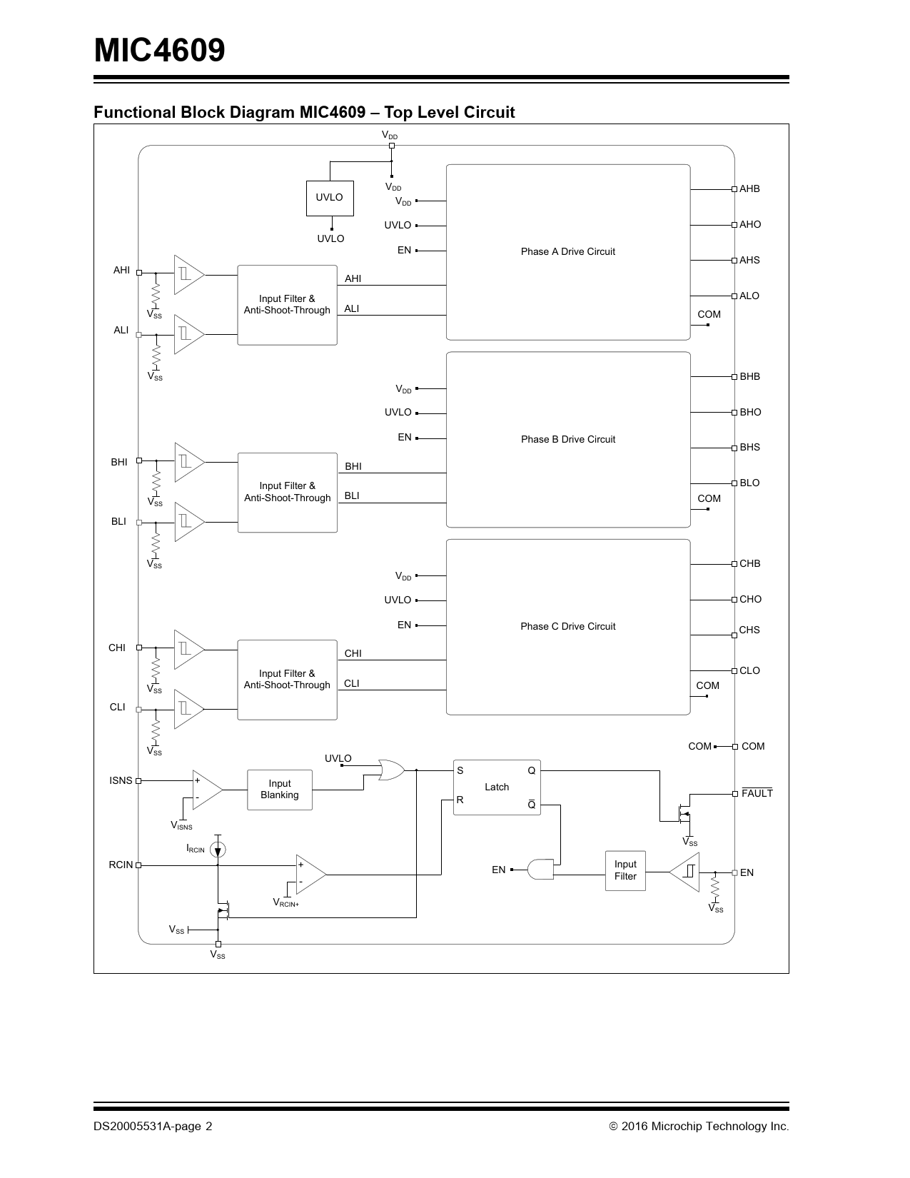 MIC4609Functional Block Diagram MIC4609 – Top Level Circuit VDD VDD AHB UVLO VDD UVLO AHO UVLO EN Phase A Drive Circuit AHS AHI AHI ALO Input Filter & ALI Anti-Shoot-Through VSS COM ALI VSS BHB VDD UVLO BHO EN Phase B Drive Circuit BHS BHI BHI BLO Input Filter & BLI Anti-Shoot-Through COM VSS BLI VSS CHB VDD UVLO CHO EN Phase C Drive Circuit CHS CHI CHI CLO Input Filter & CLI Anti-Shoot-Through COM VSS CLI COM COM VSS UVLO S Q ISNS + Input Latch - Blanking _ FAULT R Q VISNS V I SS RCIN RCIN + Input EN EN Filter - VRCIN+ VSS VSS VSS DS20005531A-page 2 2016 Microchip Technology Inc. Document Outline 600V 3-Phase MOSFET/IGBT Driver Features Typical Applications General Description Package Type Functional Block Diagram MIC4609 – Top Level Circuit Functional Block Diagram MIC4609 – Phase x Drive Circuit Typical Application Circuit MIC4609 – 300V, 3-Phase Motor Driver 1.0 Electrical Characteristics Absolute Maximum Ratings AC/DC Electrical Characteristics Temperature Characteristics 2.0 Typical Performance Curves FIGURE 2-1: VDD Quiescent Current vs. VDD Voltage. FIGURE 2-2: VDD Quiescent Current vs. Temperature. FIGURE 2-3: VHB Quiescent Current vs. VHB Voltage. FIGURE 2-4: VHB Quiescent Current vs. Temperature. FIGURE 2-5: VDD+HB Shutdown Current vs. Voltage. FIGURE 2-6: VDD+HB Shutdown Current vs. Temperature. FIGURE 2-7: VDD+HB Shutdown Current vs. Voltage. FIGURE 2-8: VDD+HB Shutdown Current vs. Temperature. FIGURE 2-9: VDD Operating Current vs. Frequency. FIGURE 2-10: VHB Operating Current vs. Frequency – One Phase. FIGURE 2-11: HO Output Sink ON-Resistance vs. VDD. FIGURE 2-12: HO Output Sink ON-Resistance vs. Temperature. FIGURE 2-13: LO Output Sink ON-Resistance vs. VDD. FIGURE 2-14: LO Output Sink ON-Resistance vs. Temperature. FIGURE 2-15: HO Output Source ON-Resistance vs. VDD. FIGURE 2-16: HO Output Source ON-Resistance vs. Temperature. FIGURE 2-17: LO Output Source ON-Resistance vs. VDD. FIGURE 2-18: LO Output Source ON-Resistance vs. Temperature. FIGURE 2-19: VDD/VHB ULVO vs. Temperature. FIGURE 2-20: Propagation Delay vs. VDD Voltage. FIGURE 2-21: Propagation Delay vs. Temperature. FIGURE 2-22: HO Rise Time vs. VDD Voltage. FIGURE 2-23: HO Fall Time vs. VDD Voltage. FIGURE 2-24: LO Rise Time vs. VDD Voltage. FIGURE 2-25: LO Fall Time vs. VDD Voltage. FIGURE 2-26: Rise/Fall Time vs. Temperature (VDD = 10V). FIGURE 2-27: Rise/Fall Time vs. Temperature (VDD = 20V). FIGURE 2-28: Dead Time vs. VDD Voltage. FIGURE 2-29: Dead Time vs. Temperature (VDD = 10V). FIGURE 2-30: Dead Time vs. Temperature (VDD = 20V). FIGURE 2-31: Overcurrent Threshold vs. VDD Voltage. FIGURE 2-32: Overcurrent Threshold vs. Temperature. FIGURE 2-33: Overcurrent Propagation Delay vs. VDD Voltage. FIGURE 2-34: Overcurrent Propagation Delay vs. Temperature. 3.0 Pin Descriptions TABLE 3-1: Pin Function Table 4.0 Functional Description 4.1 UVLO Protection 4.2 Startup and UVLO FIGURE 4-1: Startup and Fault Timing Diagram. TABLE 4-1: Operational Truth Table 4.3 Enable Inputs 4.4 Input Stage FIGURE 4-2: Input Stage Block Diagram. FIGURE 4-3: Minimum Pulse-Width Diagram. 4.5 Dead Time and Anti-Shoot-Through Protection FIGURE 4-4: Dead Time, Propagation Delay, and Rise/Fall-Time Diagram. 4.6 Low-Side Driver Output Stage FIGURE 4-5: Low-Side Driver Block Diagram. 4.7 High-Side Driver and Bootstrap Circuit FIGURE 4-6: High-Side Driver and Bootstrap Circuit Block Diagram. FIGURE 4-7: MIC4609 Motor Driver Typical Application – Phase A. 4.8 Overcurrent Protection Circuitry FIGURE 4-8: Overcurrent Fault Sequence. EQUATION 4-1: 5.0 Application Information 5.1 Bootstrap Circuit FIGURE 5-1: MIC4609 – Bootstrap Circuit. EQUATION 5-1: EQUATION 5-2: 5.2 HS Node Clamp FIGURE 5-2: Negative HS Pin Voltage. 5.3 Power Dissipation Considerations FIGURE 5-3: MIC4609 High-Side Driving an External IGBT. FIGURE 5-4: Typical Gate Charge vs. VGE. EQUATION 5-3: EQUATION 5-4: EQUATION 5-5: EQUATION 5-6: EQUATION 5-7: 5.4 Decoupling Capacitor Selection 5.5 Grounding, Component Placement and Circuit Layout FIGURE 5-5: Turn-On Current Paths. FIGURE 5-6: Turn-Off Current Paths. 6.0 Packaging Information Appendix A: Revision History Revision A (March 2016) Product Identification System Trademarks Worldwide Sales and Service