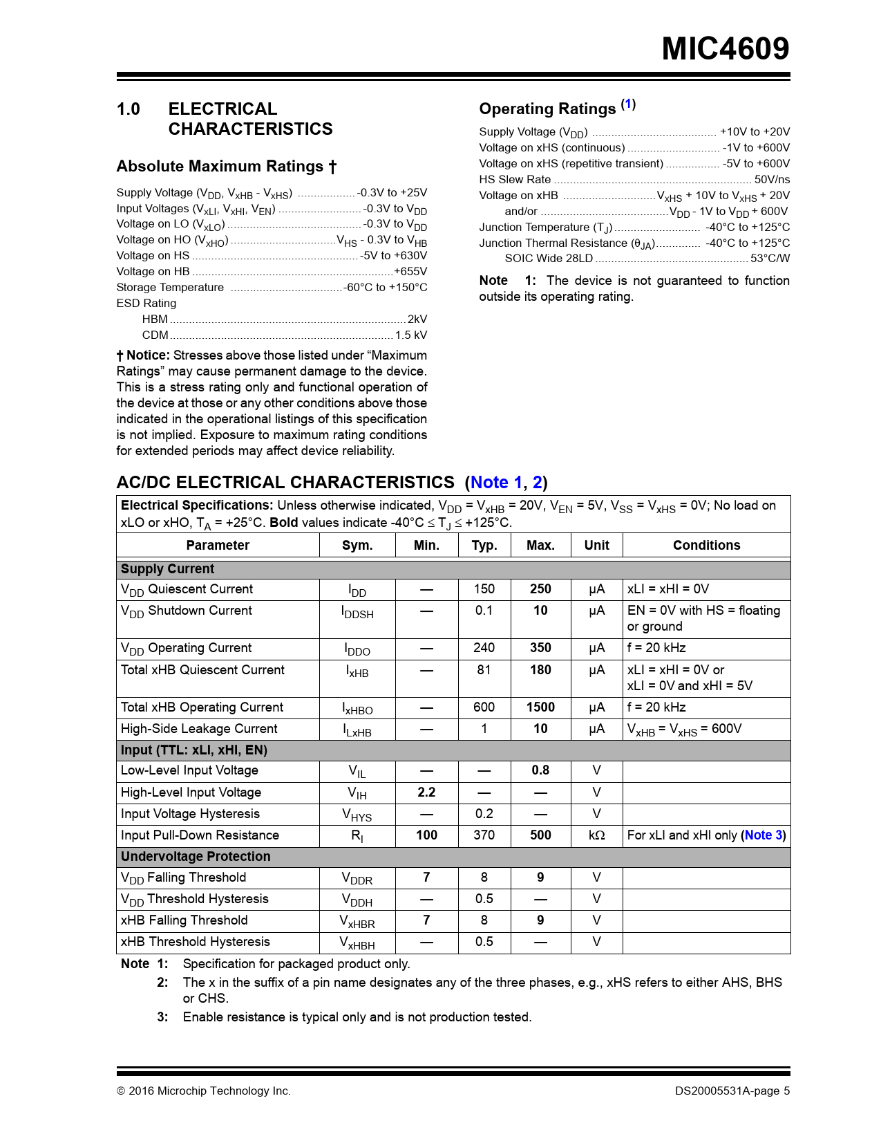 MIC4609. 1.0. ELECTRICAL. Operating Ratings (1). CHARACTERISTICS. Absolute Maximum Ratings †. Note. † Notice: