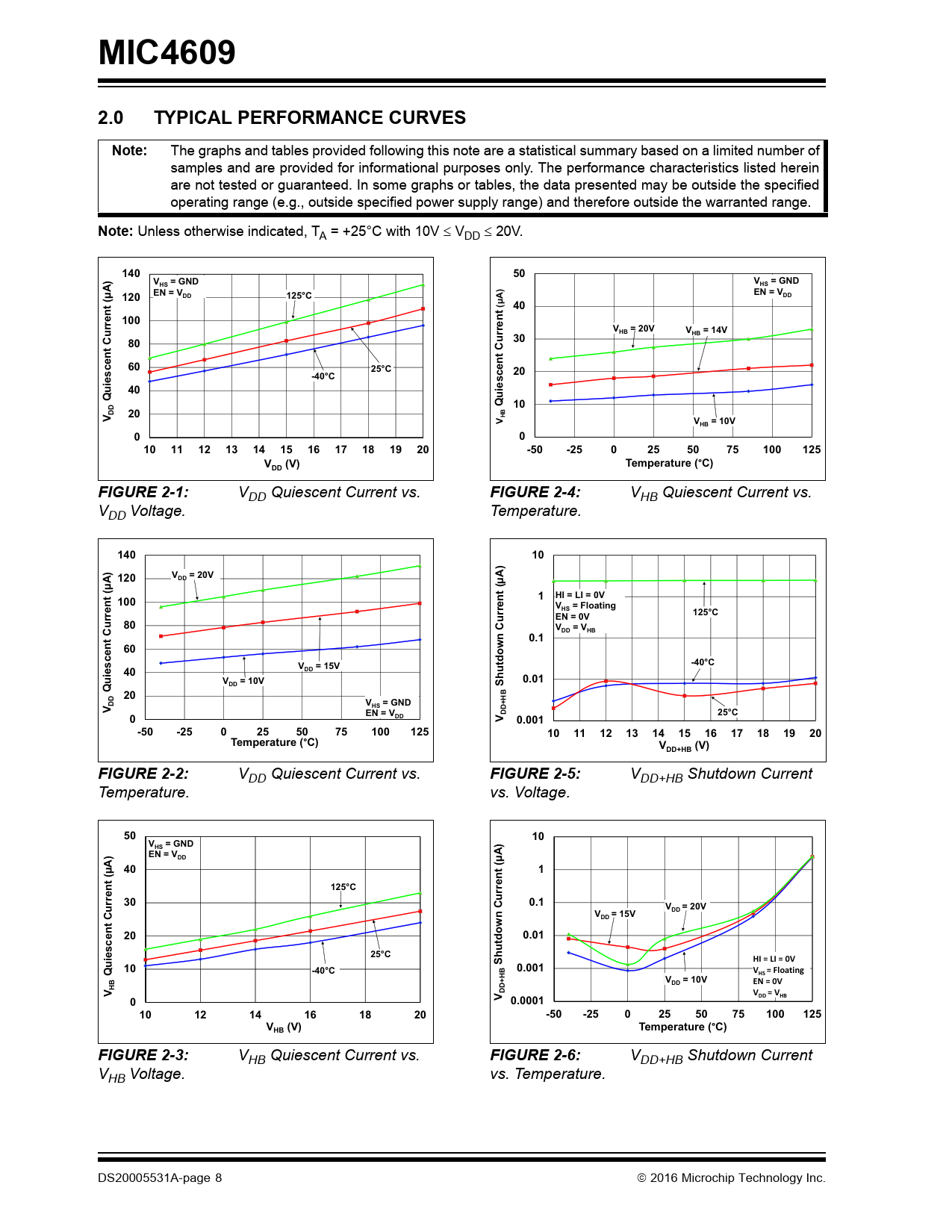 MIC46092.0TYPICAL PERFORMANCE CURVESNote: The graphs and tables provided following this note are a statistical summary based on a limited number of samples and are provided for informational purposes only. The performance characteristics listed herein are not tested or guaranteed. In some graphs or tables, the data presented may be outside the specified operating range (e.g., outside specified power supply range) and therefore outside the warranted range. Note: Unless otherwise indicated, TA = +25°C with 10V VDD 20V. 14050V= GNDV= GNDHSHSEN = VEN = V(μA)120DD125°CDD(μA)40100V= 20VHBV= 14VHB30806025°C20-40°C40iescent CurrentQuiescent Currentu Q10DD20VHBVV= 10VHB001011121314151617181920-50-250255075100125V(V)Temperature (°C)DDFIGURE 2-1: VDD Quiescent Current vs. FIGURE 2-4: VHB Quiescent Current vs. VDD Voltage. Temperature. 14010120V= 20VDD(μA)(μA)1HI = LI = 0V100V= FloatingHS125°CEN = 0V80V= VDDHBn Current0.160V= 15V-40°Ciescent Current40DDuV= 10V0.01DDShutdowQ20BDDV= GND+HVHSEN = VDD25°C0DDV0.001-50-2502550751001251011121314151617181920Temperature (°C)V(V)DD+HBFIGURE 2-2: VDD Quiescent Current vs. FIGURE 2-5: VDD+HB Shutdown Current Temperature. vs. Voltage. 5010V= GNDHS)EN = VDD(μA)401125°C300.1V= 20VDDn CurrentV= 15VDD200.0125°CShutdowHI = LI = 0V10Quiescent Current (μA-40°CB0.001V = FloatingHS+HV= 10VDDEN = 0VHBVDDV = VDDHB0V 0.0001101214161820-50-250255075100125V(V)Temperature (°C)HBFIGURE 2-3: VHB Quiescent Current vs. FIGURE 2-6: VDD+HB Shutdown Current VHB Voltage. vs. Temperature. DS20005531A-page 8 2016 Microchip Technology Inc. Document Outline 600V 3-Phase MOSFET/IGBT Driver Features Typical Applications General Description Package Type Functional Block Diagram MIC4609 – Top Level Circuit Functional Block Diagram MIC4609 – Phase x Drive Circuit Typical Application Circuit MIC4609 – 300V, 3-Phase Motor Driver 1.0 Electrical Characteristics Absolute Maximum Ratings AC/DC Electrical Characteristics Temperature Characteristics 2.0 Typical Performance Curves FIGURE 2-1: VDD Quiescent Current vs. VDD Voltage. FIGURE 2-2: VDD Quiescent Current vs. Temperature. FIGURE 2-3: VHB Quiescent Current vs. VHB Voltage. FIGURE 2-4: VHB Quiescent Current vs. Temperature. FIGURE 2-5: VDD+HB Shutdown Current vs. Voltage. FIGURE 2-6: VDD+HB Shutdown Current vs. Temperature. FIGURE 2-7: VDD+HB Shutdown Current vs. Voltage. FIGURE 2-8: VDD+HB Shutdown Current vs. Temperature. FIGURE 2-9: VDD Operating Current vs. Frequency. FIGURE 2-10: VHB Operating Current vs. Frequency – One Phase. FIGURE 2-11: HO Output Sink ON-Resistance vs. VDD. FIGURE 2-12: HO Output Sink ON-Resistance vs. Temperature. FIGURE 2-13: LO Output Sink ON-Resistance vs. VDD. FIGURE 2-14: LO Output Sink ON-Resistance vs. Temperature. FIGURE 2-15: HO Output Source ON-Resistance vs. VDD. FIGURE 2-16: HO Output Source ON-Resistance vs. Temperature. FIGURE 2-17: LO Output Source ON-Resistance vs. VDD. FIGURE 2-18: LO Output Source ON-Resistance vs. Temperature. FIGURE 2-19: VDD/VHB ULVO vs. Temperature. FIGURE 2-20: Propagation Delay vs. VDD Voltage. FIGURE 2-21: Propagation Delay vs. Temperature. FIGURE 2-22: HO Rise Time vs. VDD Voltage. FIGURE 2-23: HO Fall Time vs. VDD Voltage. FIGURE 2-24: LO Rise Time vs. VDD Voltage. FIGURE 2-25: LO Fall Time vs. VDD Voltage. FIGURE 2-26: Rise/Fall Time vs. Temperature (VDD = 10V). FIGURE 2-27: Rise/Fall Time vs. Temperature (VDD = 20V). FIGURE 2-28: Dead Time vs. VDD Voltage. FIGURE 2-29: Dead Time vs. Temperature (VDD = 10V). FIGURE 2-30: Dead Time vs. Temperature (VDD = 20V). FIGURE 2-31: Overcurrent Threshold vs. VDD Voltage. FIGURE 2-32: Overcurrent Threshold vs. Temperature. FIGURE 2-33: Overcurrent Propagation Delay vs. VDD Voltage. FIGURE 2-34: Overcurrent Propagation Delay vs. Temperature. 3.0 Pin Descriptions TABLE 3-1: Pin Function Table 4.0 Functional Description 4.1 UVLO Protection 4.2 Startup and UVLO FIGURE 4-1: Startup and Fault Timing Diagram. TABLE 4-1: Operational Truth Table 4.3 Enable Inputs 4.4 Input Stage FIGURE 4-2: Input Stage Block Diagram. FIGURE 4-3: Minimum Pulse-Width Diagram. 4.5 Dead Time and Anti-Shoot-Through Protection FIGURE 4-4: Dead Time, Propagation Delay, and Rise/Fall-Time Diagram. 4.6 Low-Side Driver Output Stage FIGURE 4-5: Low-Side Driver Block Diagram. 4.7 High-Side Driver and Bootstrap Circuit FIGURE 4-6: High-Side Driver and Bootstrap Circuit Block Diagram. FIGURE 4-7: MIC4609 Motor Driver Typical Application – Phase A. 4.8 Overcurrent Protection Circuitry FIGURE 4-8: Overcurrent Fault Sequence. EQUATION 4-1: 5.0 Application Information 5.1 Bootstrap Circuit FIGURE 5-1: MIC4609 – Bootstrap Circuit. EQUATION 5-1: EQUATION 5-2: 5.2 HS Node Clamp FIGURE 5-2: Negative HS Pin Voltage. 5.3 Power Dissipation Considerations FIGURE 5-3: MIC4609 High-Side Driving an External IGBT. FIGURE 5-4: Typical Gate Charge vs. VGE. EQUATION 5-3: EQUATION 5-4: EQUATION 5-5: EQUATION 5-6: EQUATION 5-7: 5.4 Decoupling Capacitor Selection 5.5 Grounding, Component Placement and Circuit Layout FIGURE 5-5: Turn-On Current Paths. FIGURE 5-6: Turn-Off Current Paths. 6.0 Packaging Information Appendix A: Revision History Revision A (March 2016) Product Identification System Trademarks Worldwide Sales and Service