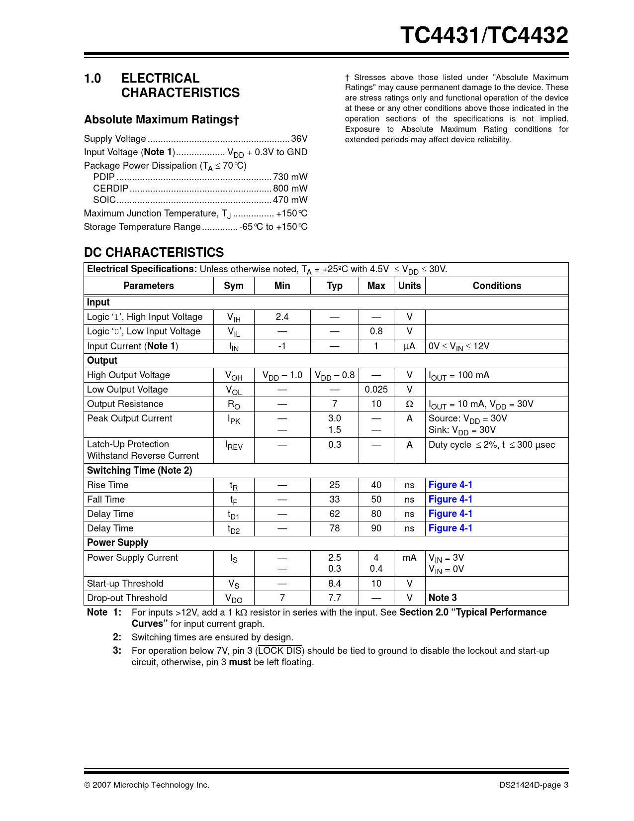 TC4431/TC4432. 1.0. ELECTRICAL. CHARACTERISTICS. Absolute Maximum Ratings†. Note 1. DC CHARACTERISTICS. Electrical Specifications:
