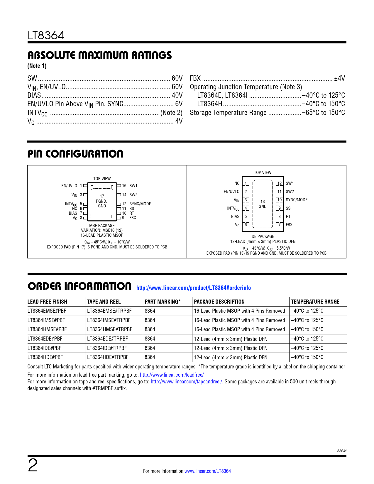 ABSOLUTE MAXIMUM RATINGS (Note 1). PIN CONFIGURATION. ORDER INFORMATION http://www.linear.com/product/LT8364#orderinfo