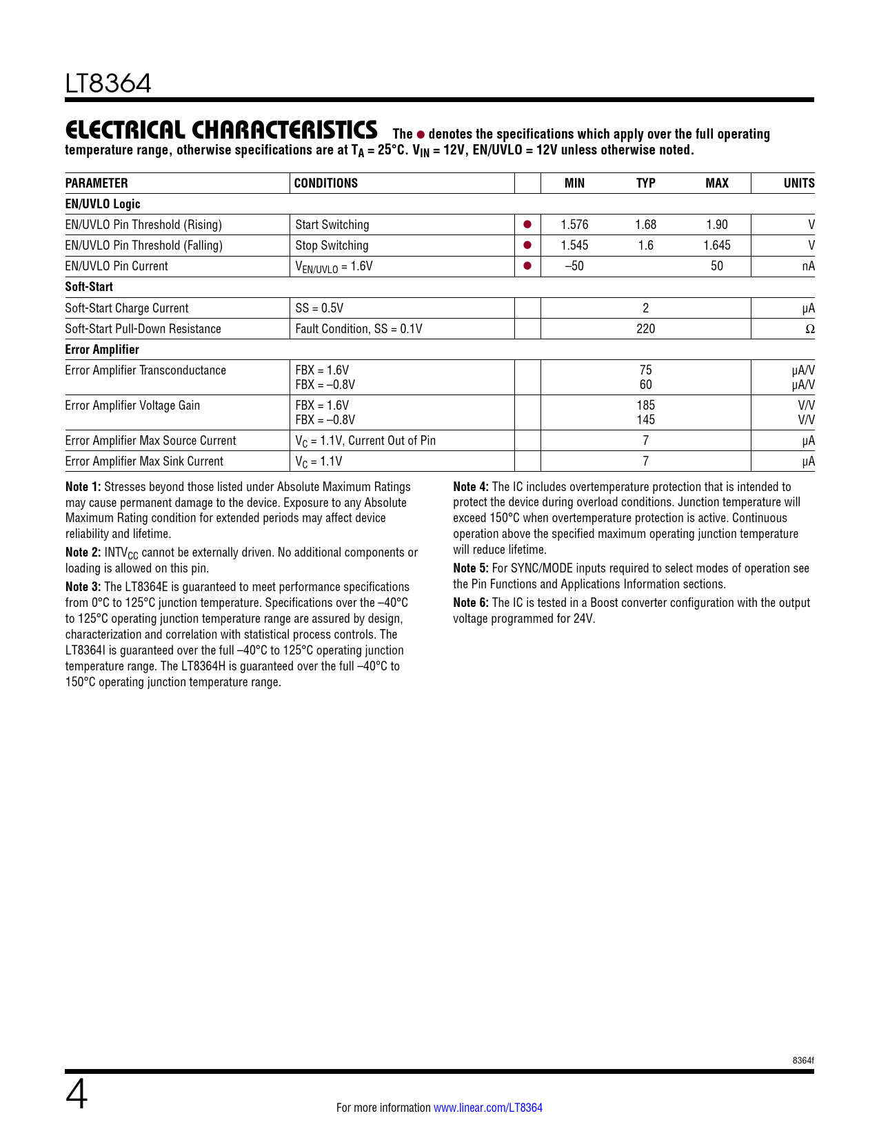 The LT8364E is guaranteed to meet performance specifications the Pin Functions and Applications Information sections. from 0°C to 125°C junction temperature. Specifications over the –40°C