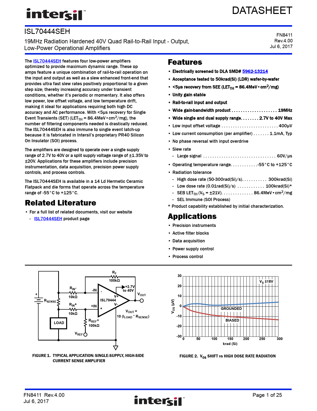 FIGURE 1. TYPICAL APPLICATION: SINGLE-SUPPLY, HIGH-SIDE FIGURE 2. VOS SHIFT vs HIGH DOSE RATE RADIATION CURRENT SENSE AMPLIFIER FN8411 Rev.4.00 Page 1 of 25 Jul 6, 2017 Document Outline Related Literature Features Applications Table of Contents Pin Configuration Pin Descriptions Ordering Information Absolute Maximum Ratings Thermal Information Recommended Operating Conditions Electrical Specifications VS = ±18V Electrical Specifications VS = ±2.5V Electrical Specifications VS = ±1.5V Electrical Specifications VS = ±18V - Post Radiation Electrical Specifications VS = ±2.5V - Post Radiation Electrical Specifications VS = ±1.5V - Post Radiation Typical Performance Curves Post High Dose Rate Radiation Characteristics Post Low Dose Rate Radiation Characteristics Applications Information Functional Description Operating Voltage Range Input Performance Input ESD Diode Protection Output Short-Circuit Current Limiting Output Phase Reversal Power Dissipation Unused Channel Configuration Die Characteristics Die Dimensions Interface Materials Glassivation Top Metallization Backside Finish Process Assembly Related Information Substrate Potential Additional Information Worst Case Current Density Transistor Count Weight of Packaged Device Lid Characteristics Metallization Mask Layout Revision History About Intersil Package Outline Drawing