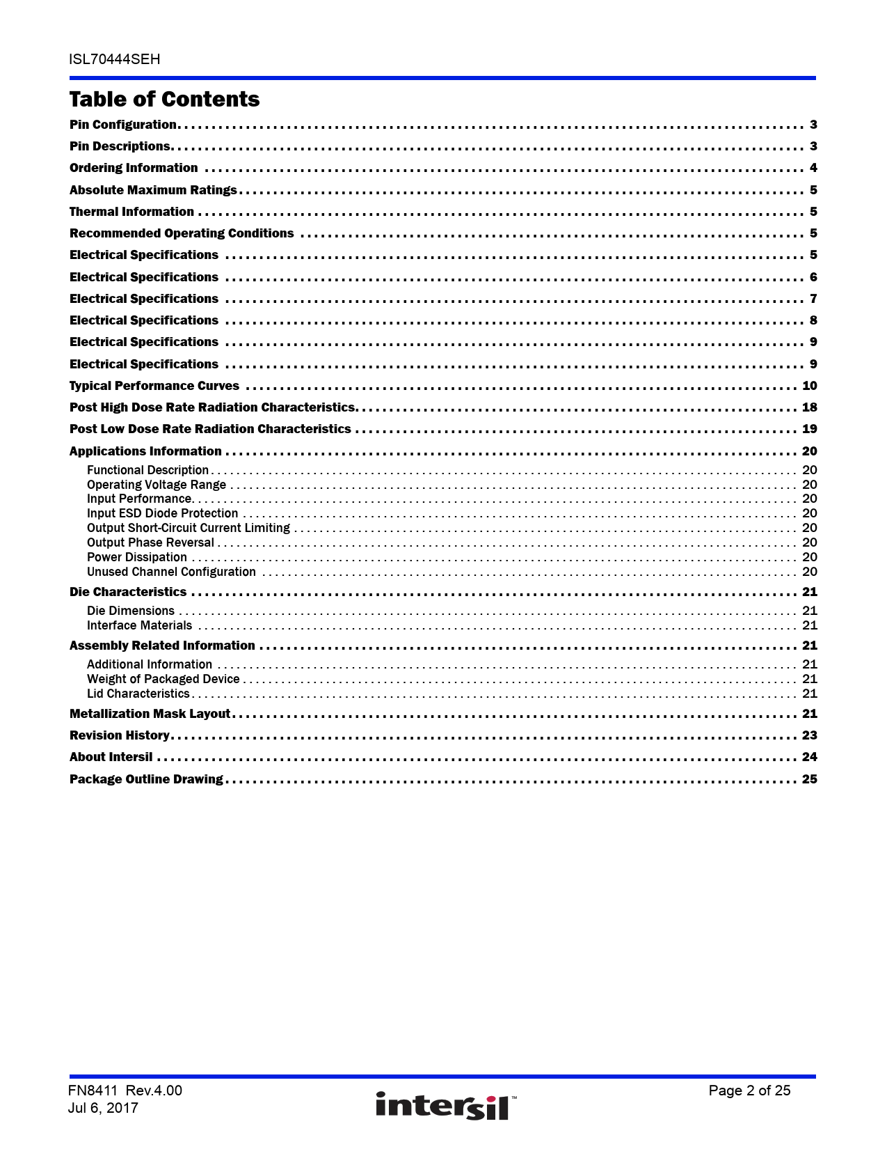link to page 3 link to page 3 link to page 4 link to page 5 link to page 5 link to page 5 link to page 5 link to page 6 link to page 7 link to page 8 link to page 9 link to page 9 link to page 10 link to page 18 link to page 19 link to page 20 link to page 20 link to page 20 link to page 20 link to page 20 link to page 20 link to page 20 link to page 20 link to page 20 link to page 21 link to page 21 link to page 21 link to page 21 link to page 21 link to page 21 link to page 21 link to page 21 link to page 23 link to page 24 link to page 25 ISL70444SEH Table of Contents Pin Configuration. 3 Pin Descriptions. 3 Ordering Information . 4 Absolute Maximum Ratings . 5 Thermal Information . 5 Recommended Operating Conditions . 5 Electrical Specifications . 5 Electrical Specifications . 6 Electrical Specifications . 7 Electrical Specifications . 8 Electrical Specifications . 9 Electrical Specifications . 9 Typical Performance Curves . 10 Post High Dose Rate Radiation Characteristics. 18 Post Low Dose Rate Radiation Characteristics . 19 Applications Information . 20 Functional Description . 20 Operating Voltage Range . 20 Input Performance. 20 Input ESD Diode Protection . 20 Output Short-Circuit Current Limiting . 20 Output Phase Reversal . 20 Power Dissipation . 20 Unused Channel Configuration . 20 Die Characteristics . 21 Die Dimensions . 21 Interface Materials . 21 Assembly Related Information . 21 Additional Information . 21 Weight of Packaged Device . 21 Lid Characteristics . 21 Metallization Mask Layout . 21 Revision History. 23 About Intersil . 24 Package Outline Drawing . 25 FN8411 Rev.4.00 Page 2 of 25 Jul 6, 2017 Document Outline Related Literature Features Applications Table of Contents Pin Configuration Pin Descriptions Ordering Information Absolute Maximum Ratings Thermal Information Recommended Operating Conditions Electrical Specifications VS = ±18V Electrical Specifications VS = ±2.5V Electrical Specifications VS = ±1.5V Electrical Specifications VS = ±18V - Post Radiation Electrical Specifications VS = ±2.5V - Post Radiation Electrical Specifications VS = ±1.5V - Post Radiation Typical Performance Curves Post High Dose Rate Radiation Characteristics Post Low Dose Rate Radiation Characteristics Applications Information Functional Description Operating Voltage Range Input Performance Input ESD Diode Protection Output Short-Circuit Current Limiting Output Phase Reversal Power Dissipation Unused Channel Configuration Die Characteristics Die Dimensions Interface Materials Glassivation Top Metallization Backside Finish Process Assembly Related Information Substrate Potential Additional Information Worst Case Current Density Transistor Count Weight of Packaged Device Lid Characteristics Metallization Mask Layout Revision History About Intersil Package Outline Drawing