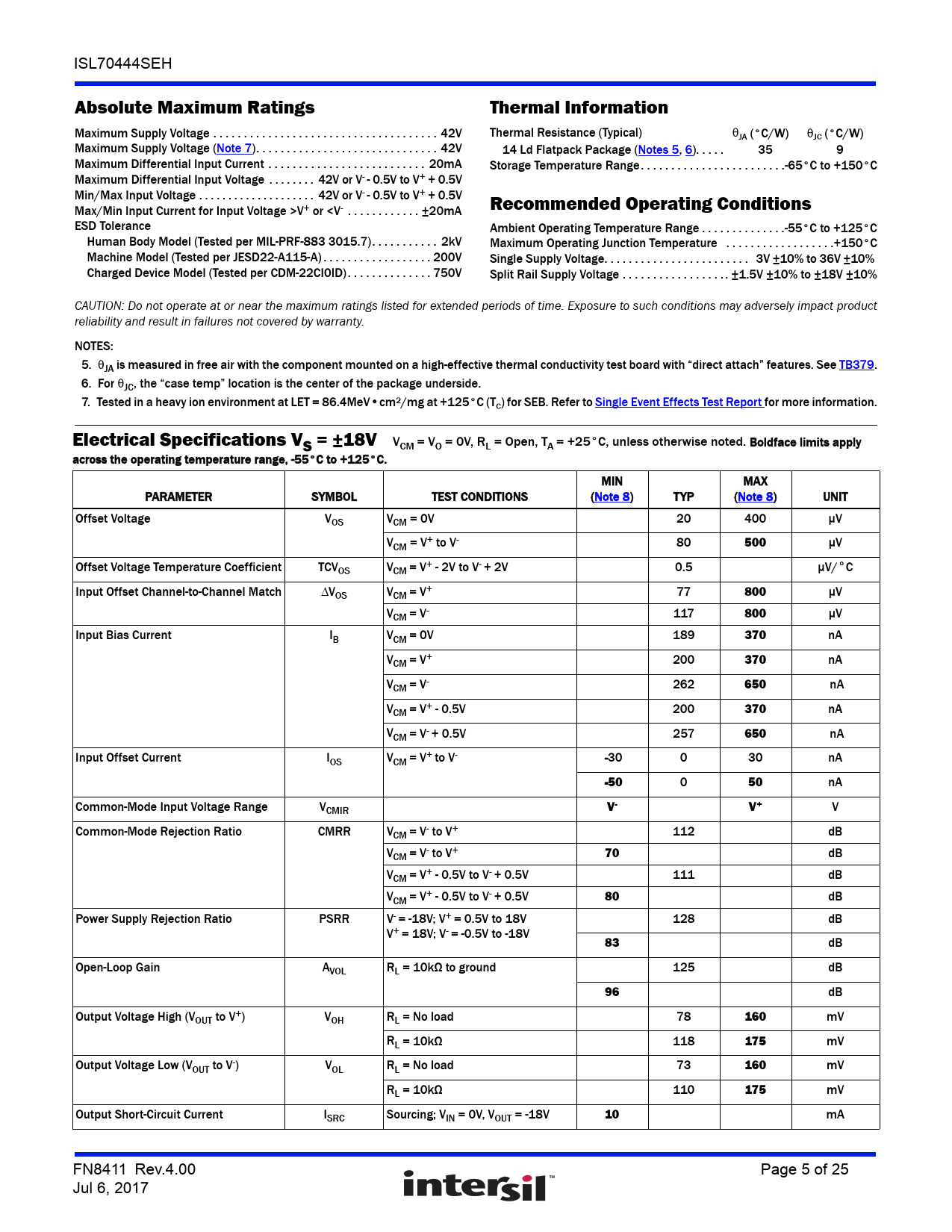 link to page 5 link to page 5 link to page 5 link to page 9 link to page 9 ISL70444SEH Absolute Maximum Ratings Thermal Information Maximum Supply Voltage . 42V Thermal Resistance (Typical) JA (°C/W) JC (°C/W) Maximum Supply Voltage (Note 7). 42V 14 Ld Flatpack Package (Notes 5, 6). 35 9 Maximum Differential Input Current . 20mA Storage Temperature Range. .-65°C to +150°C Maximum Differential Input Voltage . 42V or V- - 0.5V to V+ + 0.5V Min/Max Input Voltage . 42V or V- - 0.5V to V+ + 0.5V Recommended Operating Conditions Max/Min Input Current for Input Voltage >V+ or <V- . ±20mA ESD Tolerance Ambient Operating Temperature Range . .-55°C to +125°C Human Body Model (Tested per MIL-PRF-883 3015.7). 2kV Maximum Operating Junction Temperature . .+150°C Machine Model (Tested per JESD22-A115-A) . 200V Single Supply Voltage. 3V ±10% to 36V ±10% Charged Device Model (Tested per CDM-22CI0ID). 750V Split Rail Supply Voltage . ±1.5V ±10% to ±18V ±10% CAUTION: Do not operate at or near the maximum ratings listed for extended periods of time. Exposure to such conditions may adversely impact product reliability and result in failures not covered by warranty. NOTES: 5. JA is measured in free air with the component mounted on a high-effective thermal conductivity test board with “direct attach” features. See TB379. 6. For JC, the “case temp” location is the center of the package underside. 7. Tested in a heavy ion environment at LET = 86.4MeV•cm2/mg at +125°C (TC) for SEB. Refer to Single Event Effects Test Report for more information. Electrical Specifications VS = ±18V VCM = VO = 0V, RL = Open, TA = +25°C, unless otherwise noted. Boldface limits apply across the operating temperature range, -55°C to +125°C. MIN MAX PARAMETER SYMBOL TEST CONDITIONS (Note 8) TYP (Note 8) UNIT Offset Voltage VOS VCM = 0V 20 400 µV VCM = V+ to V- 80 500 µV Offset Voltage Temperature Coefficient TCVOS VCM = V+ - 2V to V- + 2V 0.5 µV/°C Input Offset Channel-to-Channel Match VOS VCM = V+ 77 800 µV VCM = V- 117 800 µV Input Bias Current IB VCM = 0V 189 370 nA VCM = V+ 200 370 nA VCM = V- 262 650 nA VCM = V+ - 0.5V 200 370 nA VCM = V- + 0.5V 257 650 nA Input Offset Current IOS VCM = V+ to V- -30 0 30 nA -50 0 50 nA Common-Mode Input Voltage Range VCMIR V- V+ V Common-Mode Rejection Ratio CMRR VCM = V- to V+ 112 dB VCM = V- to V+ 70 dB VCM = V+ - 0.5V to V- + 0.5V 111 dB VCM = V+ - 0.5V to V- + 0.5V 80 dB Power Supply Rejection Ratio PSRR V- = -18V; V+ = 0.5V to 18V 128 dB V+ = 18V; V- = -0.5V to -18V 83 dB Open-Loop Gain AVOL RL = 10kΩ to ground 125 dB 96 dB Output Voltage High (VOUT to V+) VOH RL = No load 78 160 mV RL = 10kΩ 118 175 mV Output Voltage Low (VOUT to V-) VOL RL = No load 73 160 mV RL = 10kΩ 110 175 mV Output Short-Circuit Current ISRC Sourcing; VIN = 0V, VOUT = -18V 10 mA FN8411 Rev.4.00 Page 5 of 25 Jul 6, 2017 Document Outline Related Literature Features Applications Table of Contents Pin Configuration Pin Descriptions Ordering Information Absolute Maximum Ratings Thermal Information Recommended Operating Conditions Electrical Specifications VS = ±18V Electrical Specifications VS = ±2.5V Electrical Specifications VS = ±1.5V Electrical Specifications VS = ±18V - Post Radiation Electrical Specifications VS = ±2.5V - Post Radiation Electrical Specifications VS = ±1.5V - Post Radiation Typical Performance Curves Post High Dose Rate Radiation Characteristics Post Low Dose Rate Radiation Characteristics Applications Information Functional Description Operating Voltage Range Input Performance Input ESD Diode Protection Output Short-Circuit Current Limiting Output Phase Reversal Power Dissipation Unused Channel Configuration Die Characteristics Die Dimensions Interface Materials Glassivation Top Metallization Backside Finish Process Assembly Related Information Substrate Potential Additional Information Worst Case Current Density Transistor Count Weight of Packaged Device Lid Characteristics Metallization Mask Layout Revision History About Intersil Package Outline Drawing