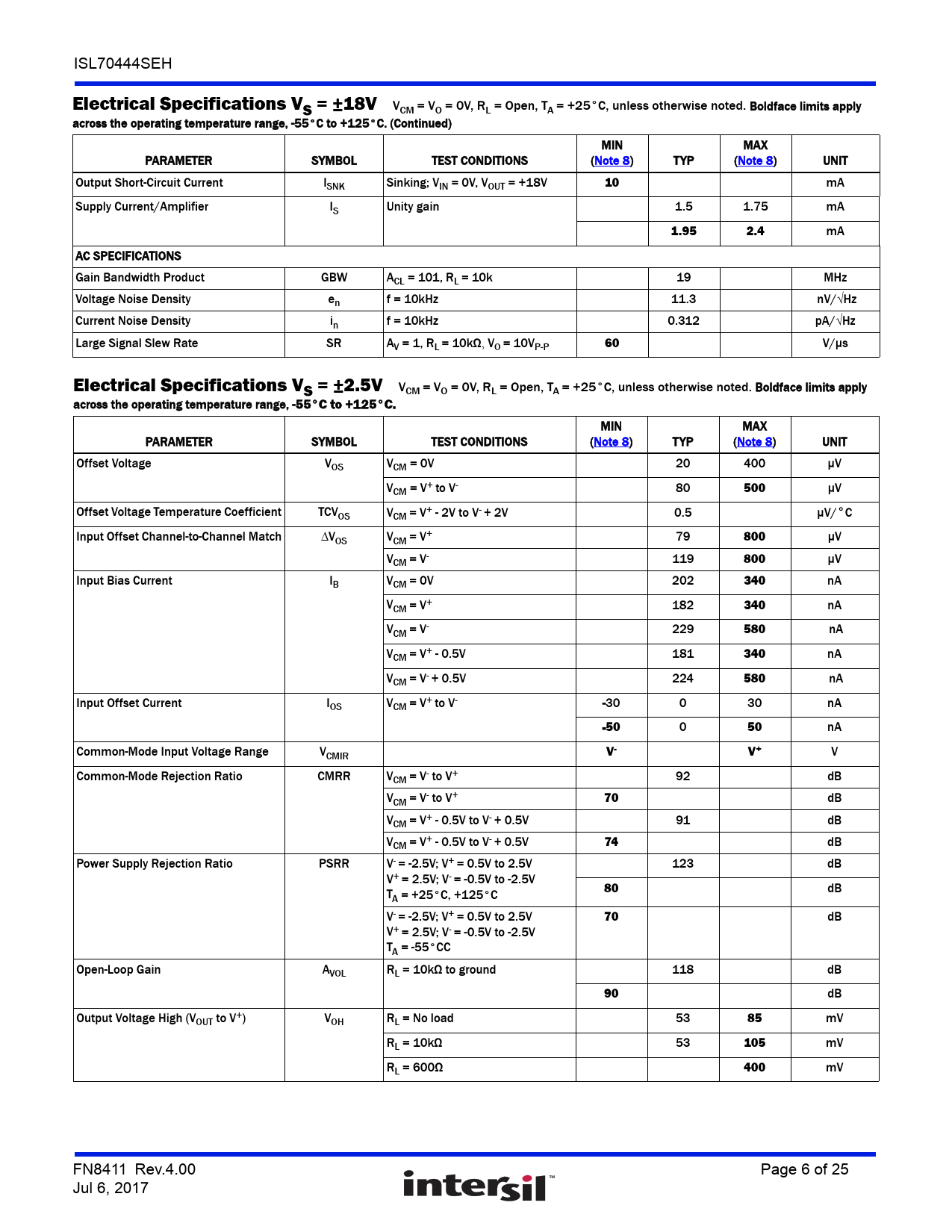 link to page 9 link to page 9 ISL70444SEH Electrical Specifications VS = ±18V VCM = VO = 0V, RL = Open, TA = +25°C, unless otherwise noted Boldface