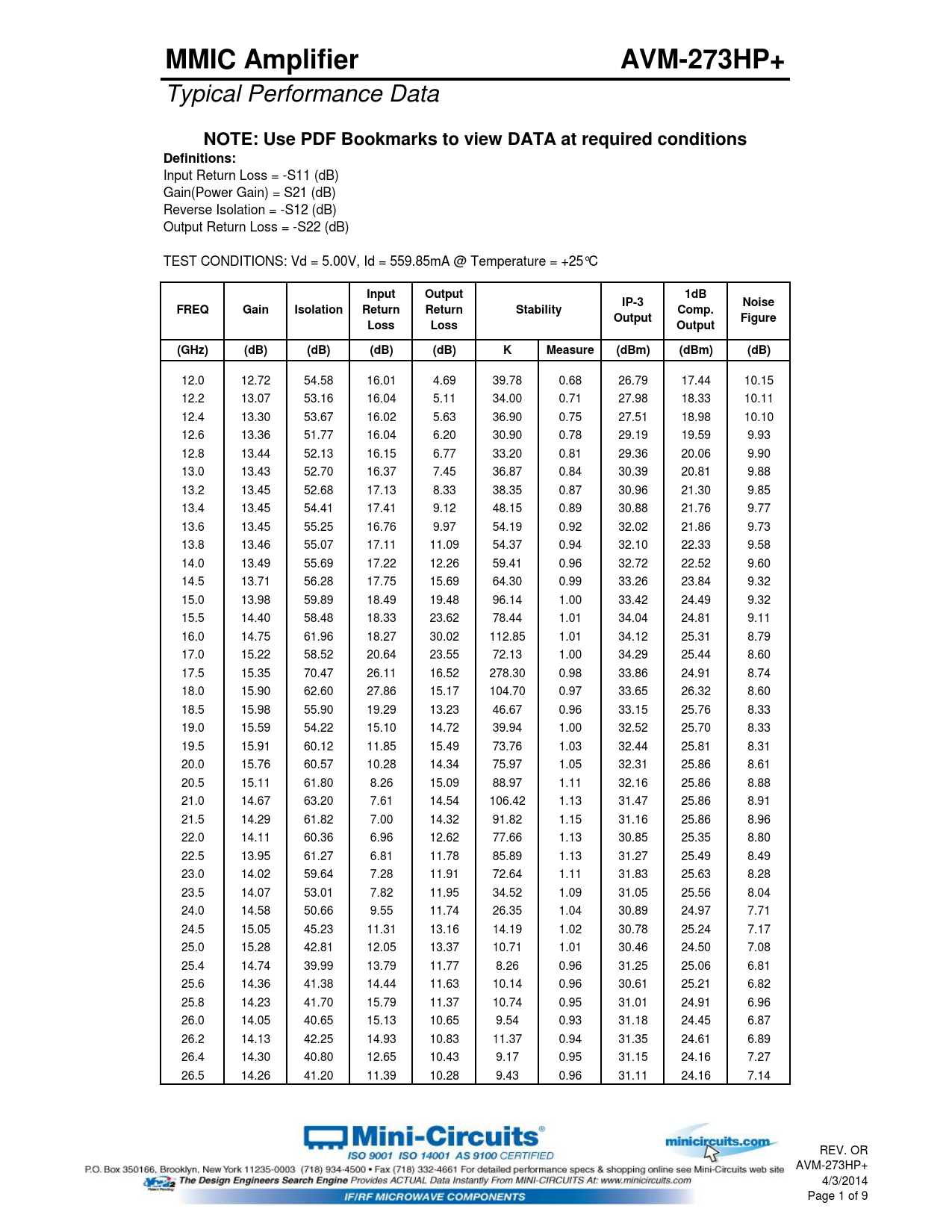 MMIC Amplifier. AVM-273HP+. NOTE: Use PDF Bookmarks to view DATA at required conditions. Definitions:. Input. Output. 1dB. IP-3. Noise