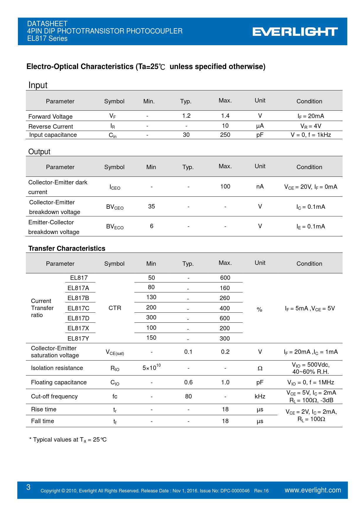 Parameter Symbol Min Typ. Max. Unit Condition EL817 50 - 600 EL817A 80 - 160 EL817B 130 Current - 260 Transfer EL817C CTR 200 - 400 % IF = 5mA ,VCE = 5V ratio EL817D 300 - 600 EL817X 100 - 200 EL817Y 150 - 300 Collector-Emitter V saturation voltage CE(sat) - 0.1 0.2 V IF = 20mA ,IC = 1mA V Isolation resistance R IO = 500Vdc, IO 5×1010 - - 40~60% R.H. Floating capacitance CIO - 0.6 1.0 pF VIO = 0, f = 1MHz V Cut-off frequency fc - 80 - kHz CE = 5V, IC = 2mA RL = 100, -3dB Rise time tr - - 18 µs VCE = 2V, IC = 2mA, RL = 100 Fall time tf - - 18 µs * Typical values at Ta = 25°C 3 Copyright © 2010, Everlight All Rights Reserved. Release Date : Nov 1, 2016. Issue No: DPC-0000046 Rev.16 www.everlight.com