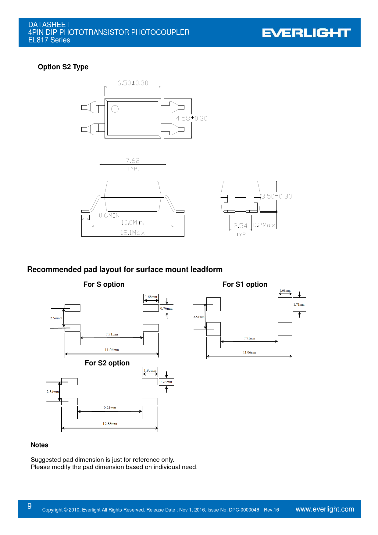 Suggested pad dimension is just for reference only. Please modify the pad dimension based on individual need. 9 Copyright © 2010, Everlight All Rights Reserved. Release Date : Nov 1, 2016. Issue No: DPC-0000046 Rev.16 www.everlight.com