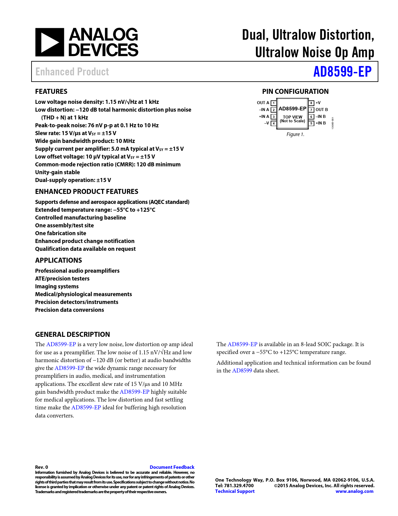 The AD8599-EP is a very low noise, low distortion op amp ideal The AD8599-EP is available in an 8-lead SOIC package. It is for use as a preamplifier. The low noise of 1.15 nV/√Hz and low specified over a −55°C to +125°C temperature range. harmonic distortion of −120 dB (or better) at audio bandwidths Additional application and technical information can be found give the AD8599-EP the wide dynamic range necessary for in the AD8599 data sheet. preamplifiers in audio, medical, and instrumentation applications. The excellent slew rate of 15 V/μs and 10 MHz gain bandwidth product make the AD8599-EP highly suitable for medical applications. The low distortion and fast settling time make the AD8599-EP ideal for buffering high resolution data converters.