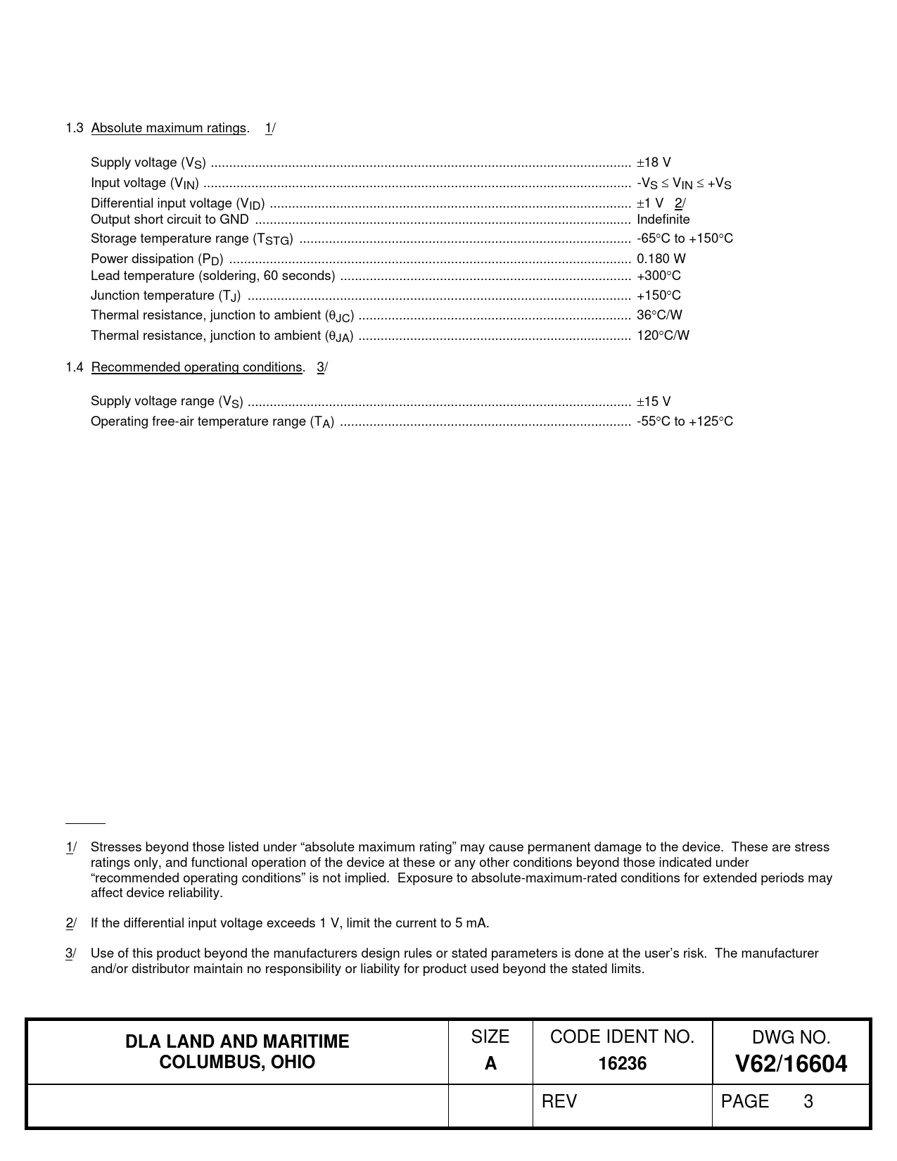 1.3 Absolute maximum ratings. 1/ Supply voltage (VS) .. 18 V Input voltage (VIN) .. -VS  VIN  +VS Differential input voltage (VID) .. 1 V 2/ Output short circuit to GND .. Indefinite Storage temperature range (TSTG) .. -65C to +150C Power dissipation (PD) ... 0.180 W Lead temperature (soldering, 60 seconds) ... +300C Junction temperature (TJ) .. +150C Thermal resistance, junction to ambient (JC) .. 36C/W Thermal resistance, junction to ambient (JA) .. 120C/W 1.4 Recommended operating conditions. 3/ Supply voltage range (VS) .. 15 V Operating free-air temperature range (TA) ... -55C to +125C 1/ Stresses beyond those listed under “absolute maximum rating” may cause permanent damage to the device. These are stress ratings only, and functional operation of the device at these or any other conditions beyond those indicated under “recommended operating conditions” is not implied. Exposure to absolute-maximum-rated conditions for extended periods may affect device reliability. 2/ If the differential input voltage exceeds 1 V, limit the current to 5 mA. 3/ Use of this product beyond the manufacturers design rules or stated parameters is done at the user’s risk. The manufacturer and/or distributor maintain no responsibility or liability for product used beyond the stated limits.