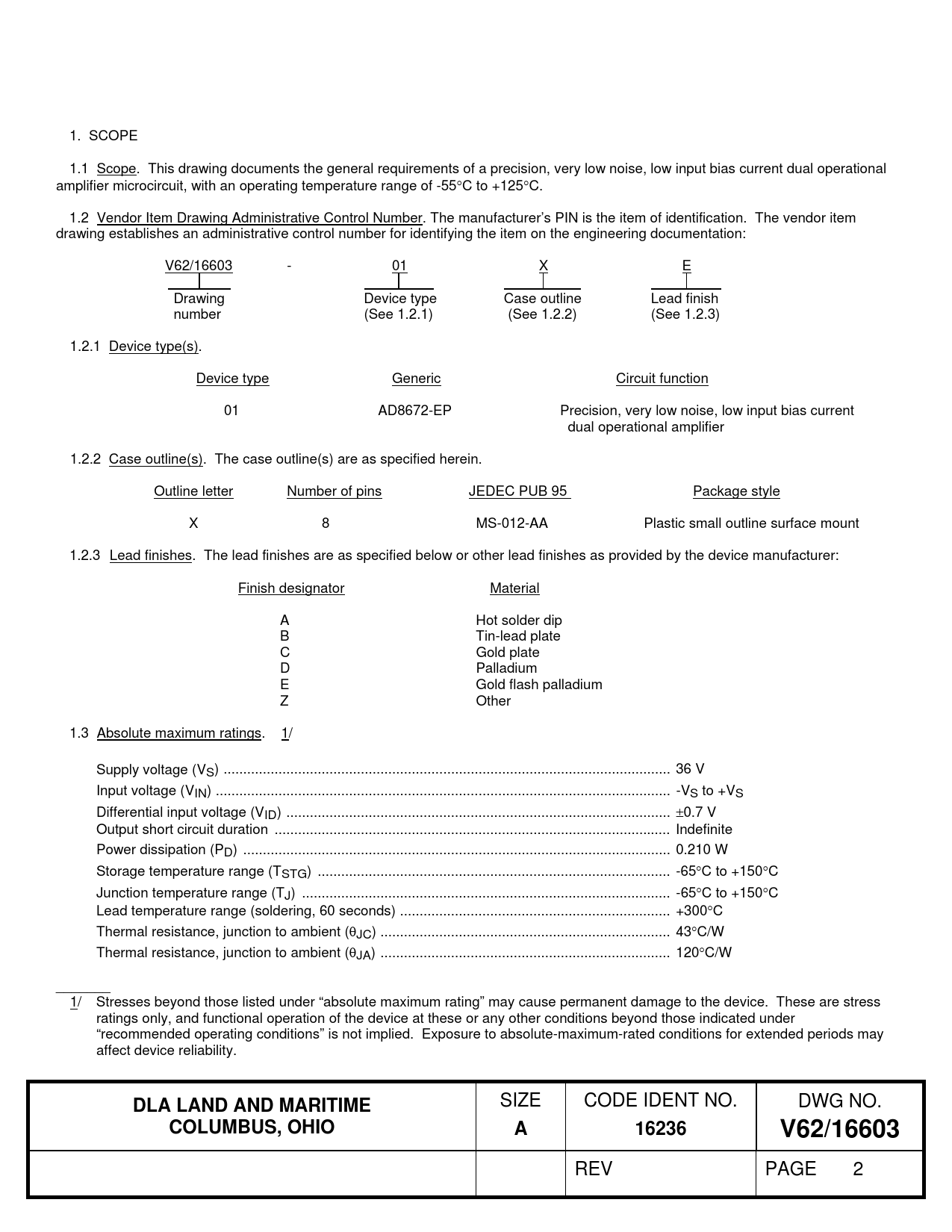 1. SCOPE 1.1 Scope. This drawing documents the general requirements of a precision, very low noise, low input bias current dual operational amplifier microcircuit, with an operating temperature range of -55C to +125C. 1.2 Vendor Item Drawing Administrative Control Number. The manufacturer’s PIN is the item of identification. The vendor item drawing establishes an administrative control number for identifying the item on the engineering documentation: V62/16603 - 01 X E Drawing Device type Case outline Lead finish number (See 1.2.1) (See 1.2.2) (See 1.2.3) 1.2.1 Device type(s). Device type Generic Circuit function 01 AD8672-EP Precision, very low noise, low input bias current dual operational amplifier 1.2.2 Case outline(s). The case outline(s) are as specified herein. Outline letter Number of pins JEDEC PUB 95 Package style X 8 MS-012-AA Plastic small outline surface mount 1.2.3 Lead finishes. The lead finishes are as specified below or other lead finishes as provided by the device manufacturer: Finish designator Material A Hot solder dip B Tin-lead plate C Gold plate D Palladium E Gold flash palladium Z Other 1.3 Absolute maximum ratings. 1/ Supply voltage (VS) .. 36 V Input voltage (VIN) .. -VS to +VS Differential input voltage (VID) .. 0.7 V Output short circuit duration ... Indefinite Power dissipation (PD) ... 0.210 W Storage temperature range (TSTG) .. -65C to +150C Junction temperature range (TJ) .. -65C to +150C Lead temperature range (soldering, 60 seconds) ... +300C Thermal resistance, junction to ambient (JC) .. 43C/W Thermal resistance, junction to ambient (JA) .. 120C/W _______ 1/ Stresses beyond those listed under “absolute maximum rating” may cause permanent damage to the device. These are stress ratings only, and functional operation of the device at these or any other conditions beyond those indicated under “recommended operating conditions” is not implied. Exposure to absolute-maximum-rated conditions for extended periods may affect device reliability.